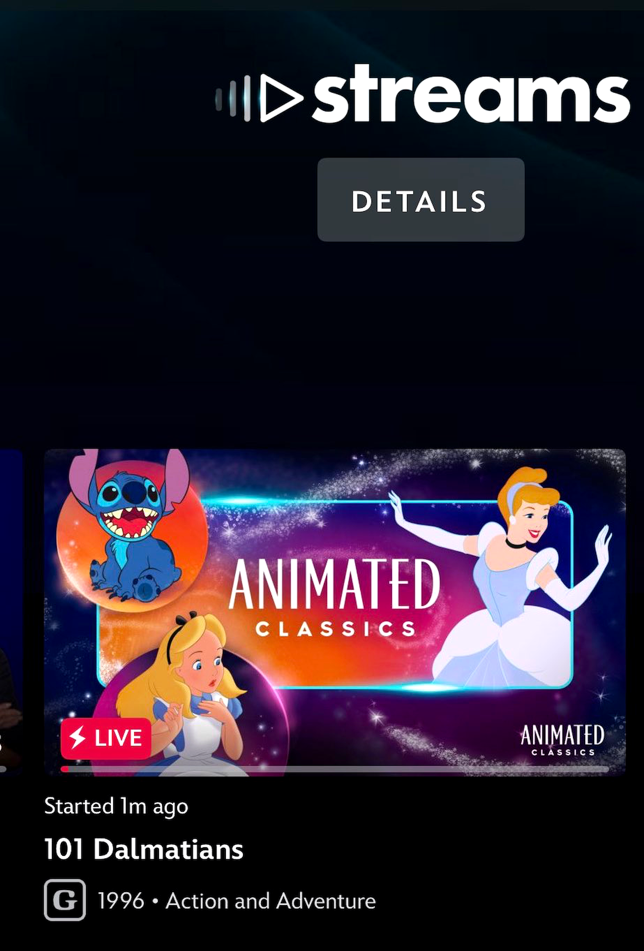 - Certainly, fans could expect to find that live-action film on Disney+ with ease, though it was a bit surprising to see it in the Animated Classics 24/7 stream, which - as the name suggests - sticks solely to the animated fare.