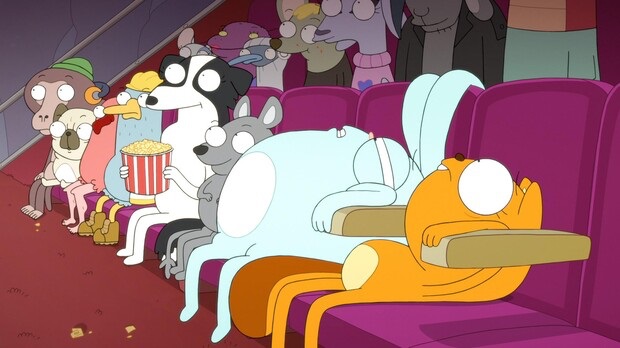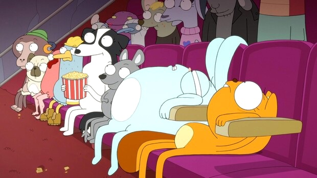 In the theater itself, Kiff and Barry are realizing the error of their ways by sneaking into this theater as the seats are quickly filling up. Surely, if this movie is sold out, then there will be three too many people looking for an extra seat. Their goose is cooked for sure.