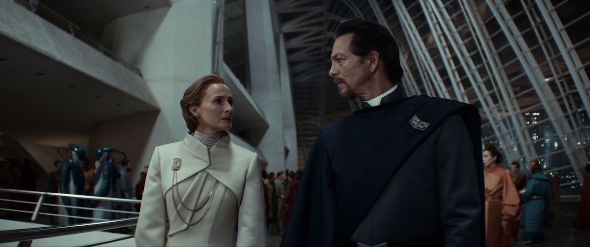 Cassian demands that Luthen join him on traveling to Yavin IV, but Luthen refuses, saying there’s still work to be done on Coruscant. Luthen gives a speech to Cassian implying that fate brought them together, and then Kleya returns to complete the planning, saying that if Mon Mothma gets arrested, “it all comes down." We see Kloris calling into the ISB and explaining that Mon was upset that morning about the news coming out of Ghorman, and next we get a look at how the security checkpoint works going into the Senate. Cassian enters using his new alias as a HoloNet news reporter, and a guard lets him pass despite not having a room assigned to him. Then we see Bail’s team of three people (two men and one woman) as they prepare to escort Mon out of the building after her speech. At the ISB, Supervisor Lagret (Michael Jenn) receives word about the possibility of Mon’s speech, and then we see Bail approach Mon in a Senate hallway. “Here we are. The day has finally come," says Mon to Bail.