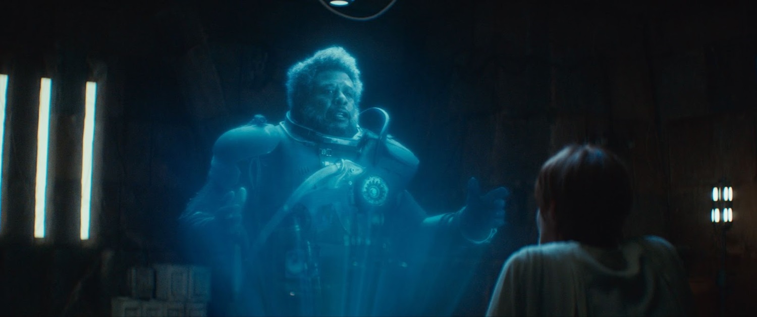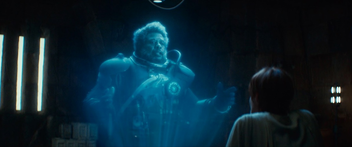 Upstairs, a flash bang goes off and Cassian is temporarily blinded and blaster shots are traded between Melshi and the troops. K-2SO arrives on the appropriate floor while Partagaz sends out reinforcements. K takes Heert as a prisoner and hilariously uses him as a shield against the troopers’ blasters. From Cassian’s perspective, we see Heert’s body go flying into the wall and K round the corner. “Cassian, I’ve cleared the path." At ISB HQ, panic sets in as Partagaz realizes his quarry is getting away. Cassian, Melshi, Kleya, and K-2SO board the U-wing and take off, bypassing the Empire’s reinforcements. Inside the ship, Melshi keeps Kleya awake and K says, “I assume any doubts about my value have been erased." Then we cut to Yavin IV, when the usual hustle and bustle is taking place around the rebel hangar. In an interior chamber, Mon Mothma (Genevieve O’Reilly) and Bail Organa (Benjamin Bratt) converse with a defiant Saw Gerrera (Forrest Whitaker) via hologram. “It’s the Empire that’s after you, Saw, not us," Mon assures him. “If only you could fight as well as you lie," Gerrera responds.