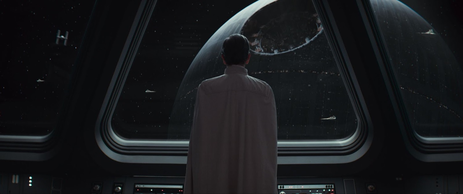 We see boots of rebel soldiers on the ground, led by Melshi, as Cassian walks off toward his destiny. Then there’s a montage of other characters’ fates, including Wilmon and Dreena (Ella Pellegrini) sharing tea, Mon Mothma chatting with her cousin Vel in the mess hall, Perrin Fertha (Alastair Mackenzie) going home with Davo Sculdun’s wife Runai (Rosalind Halstead) in his hovercar, Kleya waking up, and Dedra Meero in a prison cell on Narkina-5. Kleya watches the rebel troops prepare for the coming war, and Cassian passes by the Force healer, who gives him a knowing look as he approaches the U-wing. On Jedha, we see Saw Gerrera looking off into the horizon as the star destroyer hovers over Jedha City. Cassian boards the U-wing and we see Orson Krennic (Ben Mendelsohn) looking out over the under-construction Death Star. On the U-wing, Cassian tells K-2SO that their destination is the Ring of Kafrene. “Get us out of here," he tells K, as the U-wing leaves the airfield outside of the Massassi temple and flies off.
