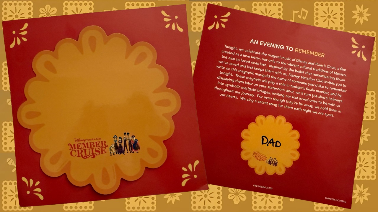 For the performance of “Remember Me," veteran Broadway performer Rodney Ingram joined Sergio Mendoza and Alex Gonzalez in an arrangement created by Walt Disney World music director Jim Abbott. Guests held up their marigold flowers as cameras projected the names onto the screen. This section also included a tribute to the DVC Member Cruise Legends who have crossed the marigold bridge, names that included Roy E. Disney, Richard Sherman, Marty Sklar, Burny Matinson, and X. Atencio.
