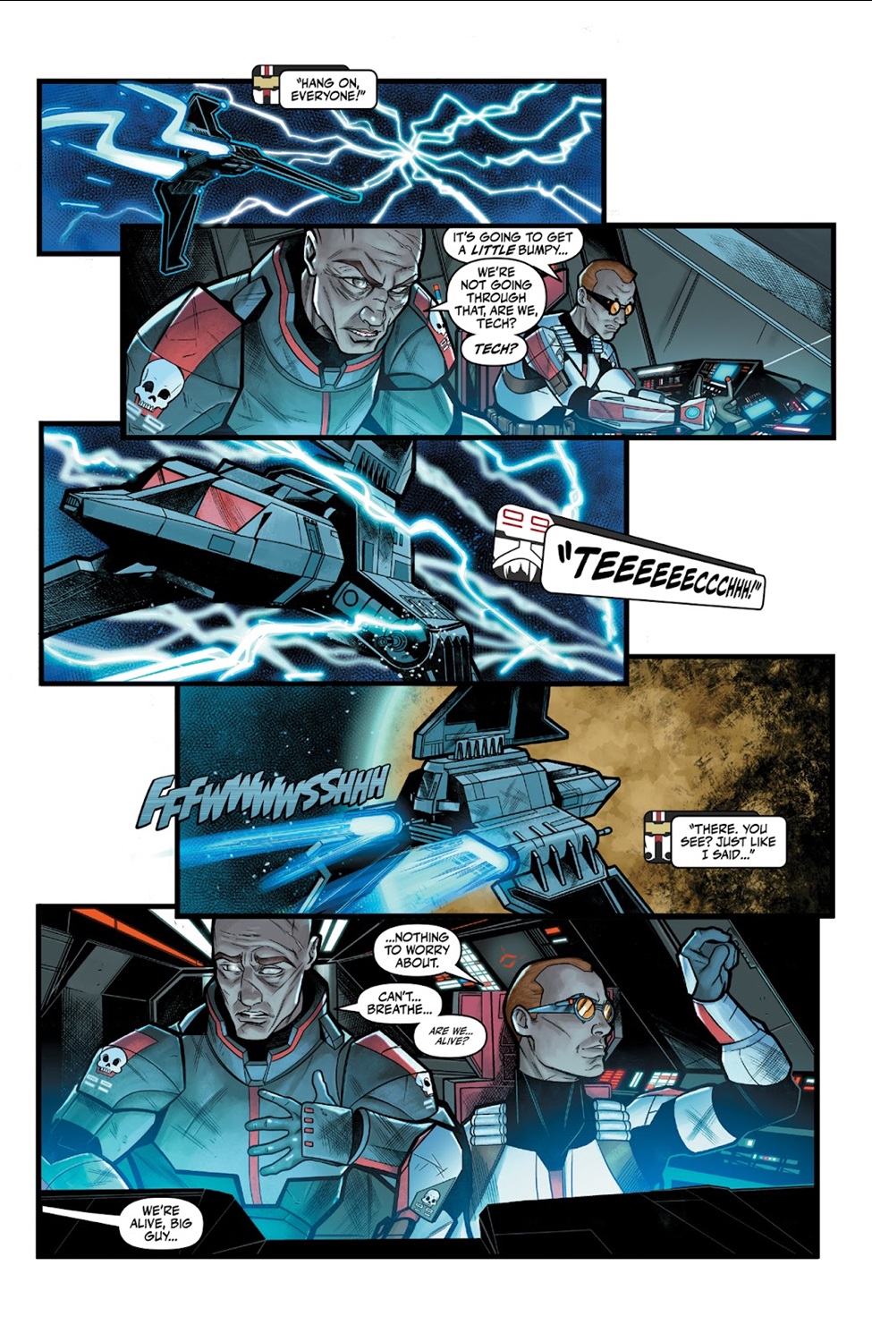 Hyperspace Stories - The Bad Batch: Ghost Agents #2 begins in the Akkadese Maelstrom in the Kessel sector, where Wrecker is nauseated by the turbulence as the Marauder careens toward its destination. Finally arriving on Kessel in pursuit of their prey, the members of Clone Force 99 peer over a canyon’s edge and spot the thief from the previous issue (it’s been more than a month and a half since that was released, so I’m struggling to remember what it was exactly that this person stole– could have used a text-crawl recap here as a reminder) talking with a representative of the Pyke syndicate. A deal is struck and the thief is permitted to board a Pyke shuttle and fly away, but not before the Bad Batch short-circuits a spice converter, causing an explosion as a distraction.