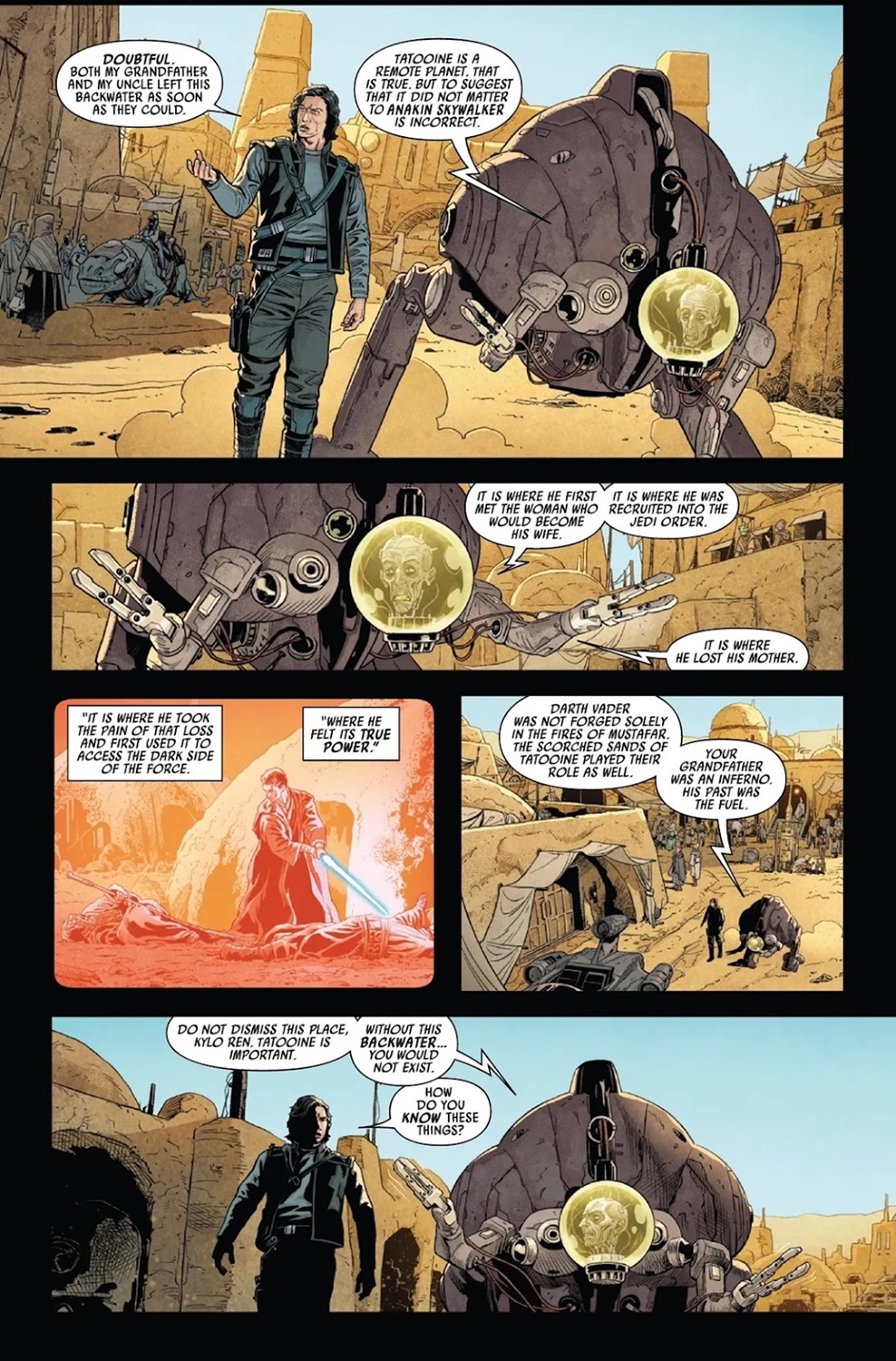 Legacy of Vader #2 begins on the Tatooine, where Vaneé– the caretaker of Fortress Vader back on Mustafar– has brought Kylo Ren on a tour of his grandfather Anakin Skywalker’s past on the infamous desert planet. The first thing I really liked right off the bat in this issue was Vaneé insisting that Tatooine is in fact important to the Skywalker legacy, despite Luke’s speech about it being far from the center of the galaxy in the original Star Wars film. Vaneé tells Kylo how he managed to access Emperor Palpatine’s files on Darth Vader after both of the Sith Lords were killed during the Battle of Endor, and then they visit the Grand Arena of Mos Espa, where Anakin famously won the Boonta Eve Classic in Star Wars: Episode I - The Phantom Menace. There, Ren learns how his grandfather was the only human ever to win the race, and then he and Vaneé are jumped by some local street toughs, who Kylo dispatches using his Force and lightsaber abilities rather easily.