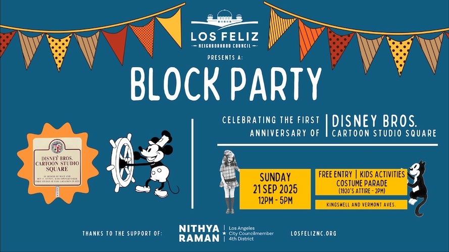 - Taking place on Sunday, September 21st, the entire community is invited to enjoy a neighborhood block party full of activities, in the place where Walt Disney and his brother Roy arrived in Los Angeles to make their dreams a reality with that first cartoon studio in Los Feliz.