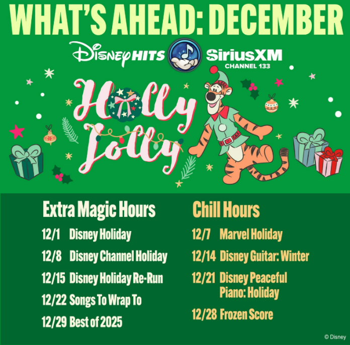 Disney Hits on SiriusXM Channel 133 has announced a full slate of holiday programming to accompany listeners through the busy month of December.