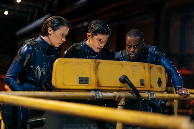 Upon landing, the soldiers train their guns to the Doctor and Belinda, but the Doctor is able to assert authority through the use of his psychic paper. We get to see some great acting from Sethu as the two characters try to figure out some information about where they’ve landed. They find out from Troop Leader Shaya (Caoilfhionn Dunne) that the squad traveled to this mining operation, where 15 days prior, all contact with those on board the station was lost – with 35 colonists lost, and possibly deceased.