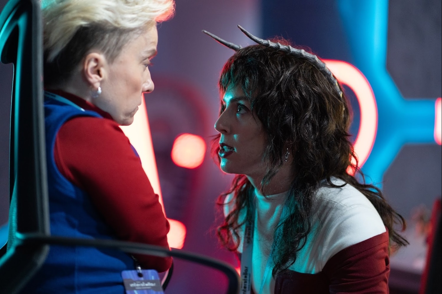 The Doctor gets his final reading from the vindicator, which Mrs. Flood spots and thanks the Doctor (to herself), saying it's the final link. So while it seems her plan is ready to go, she decides to stick around for a while and enjoy the song contest. The Doctor wonders whose seats they’ve taken, and we cut to a couple, Mike (Kadiff Kirwan) and Gary (Charlie Condou), who are being blocked from entering their seats. We’re also introduced to the droneguards that provide security for the arena, who begin saying “phase 1 activated." This is revealed to be the first step of a plan by someone named Kid (Freddie Fox), who enters the control room after shooting some people. His species is Hellion, a race that is mostly humanoid – save for the horns on their head.