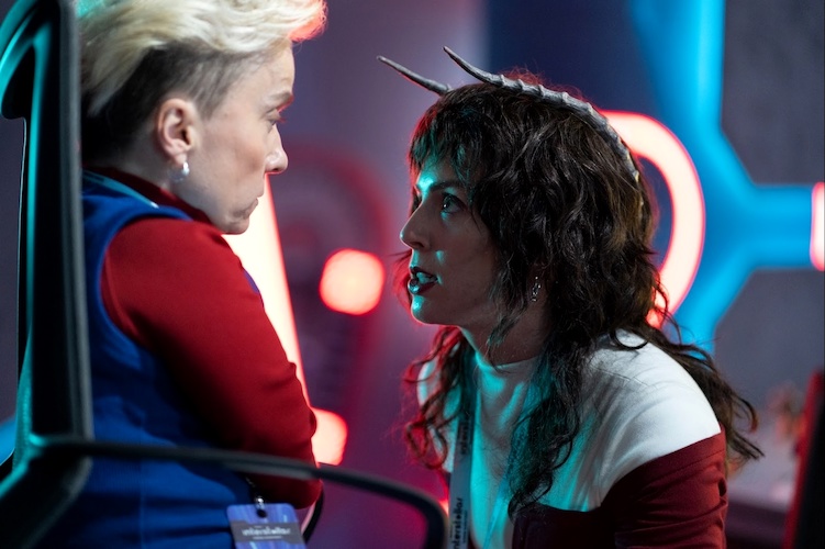 Kid says that “I’m only doing the things you expect of me," as it’s revealed that Hellions are looked down upon by much of the rest of the universe – partially due to their horns and people’s ignorance. Nina tries to plead with the Hellions, saying that the mavity shield is still on and that the people floating in space are not dead, but just frozen. But there’s no reasoning with Kid, who brings out his final phase, a Delta Wave. Belinda meets with other survivors, one of the performers, Cora Saint Bavier (Miriam-Teak Lee) and her producer. She has a bit of a breakdown, but gets comforted by Cora. Belinda realizes that the Doctor got sucked out into space, and gets sad that she never got to tell him how wonderful he is.