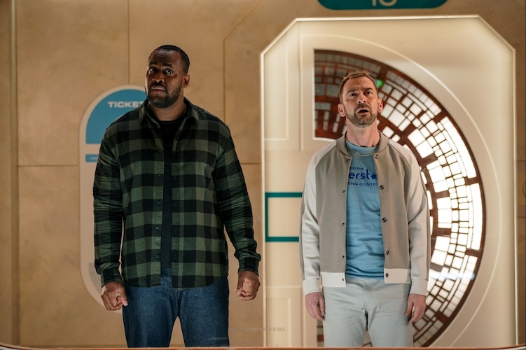The episode opens on a shot of the gigantic Harmony Arena floating in space, which serves as the setting for the Interstellar Song Contest. One of the two hosts of the festivities is revealed to be a cryogenically frozen Rylan, a real-life popular figure in the UK. It seems as if he’s been frozen and just keeps getting wheeled out for these events every few centuries. Meanwhile, the Doctor (Ncuti Gatwa) and Belinda (Varada Sethu) arrive in the audience to get a final vindicator result, before they both realize where they are and decide they have to stay – bringing us to the title sequence.