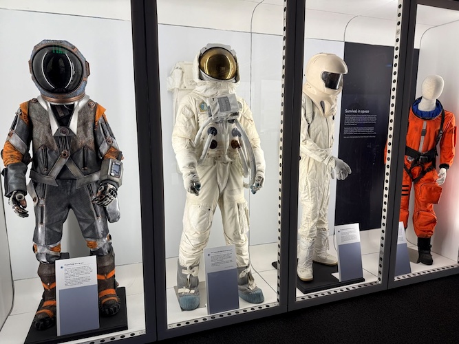 A collection of spacesuits from various stories are lined up together, including the iconic orange spacesuit, used by all modern Doctors except for Christopher Eccleston and Ncuti Gatwa.