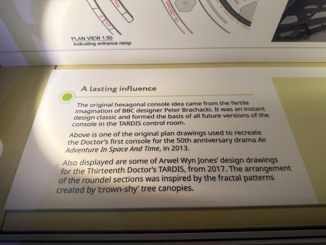 A faithful recreation of the original TARDIS console created for the 2013 docudrama An Adventure in Space and Time, which chronicled the creation of the show in the 1960s, is proudly displayed. The console was later used in the 2017 episode “Twice Upon a Time" and later for Jo Martin’s Fugitive Doctor.