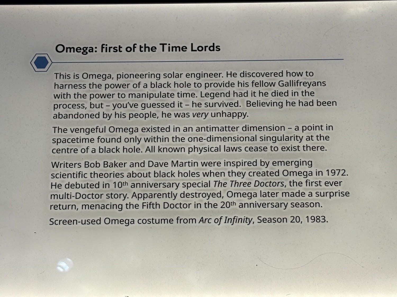 Omega, who made a “triumphant return" in the most recent season finale, appears via his costume from the 1983 serial “Arc of Infinity."