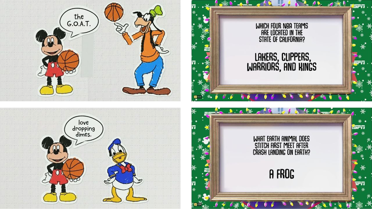 Many elements from last year returned: Hidden Mickeys sprinkled throughout the broadcast, explainer clips breaking down terms like “coast to coast,” “brick,” and even “G.O.A.T.” Gingerbread figures reprised their roles as referees, Santa’s elves operated the cameras, Goofy consumed massive amounts of churros, and Mickey and friends subbed into the game. But this year, Stitch crashed the party, bringing far more chaos than anyone likely anticipated.