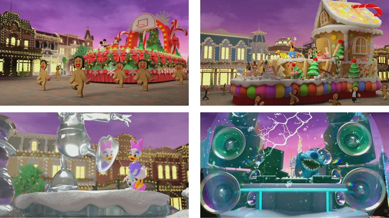 I suspect halftime provided a moment when the broadcast could take a breath and reassert control, since the content wasn’t live-rendering. Last year’s Slam Dunk Competition was replaced with a Halftime Float Competition. I’d hoped this might allow for a broader mix of Disney characters (much like the parks parade), but they kept to the characters we’d been seeing throughout the program. Four floats were presented to the judging crew of Commissioner Adam Silver and a pair of elves created by Mickey & Minnie, Goofy & Pluto, Donald & Daisy, and Stitch. Mickey & Minnie’s float included a basketball court so they had a chance to show off skills reminiscent of last year’s dunk competition. Goofy’s gingerbread house float nearly missed judging altogether after he began snacking on it mid-presentation, while Donald’s ice sculpture was destroyed thanks to distractions from Chip and Dale. As expected, Stitch wowed the crowd and took home the top prize with a high-energy display. Monsters Funday’s Cheer Canister Challenge remains the most entertaining halftime to date, feeling more like an animated short.