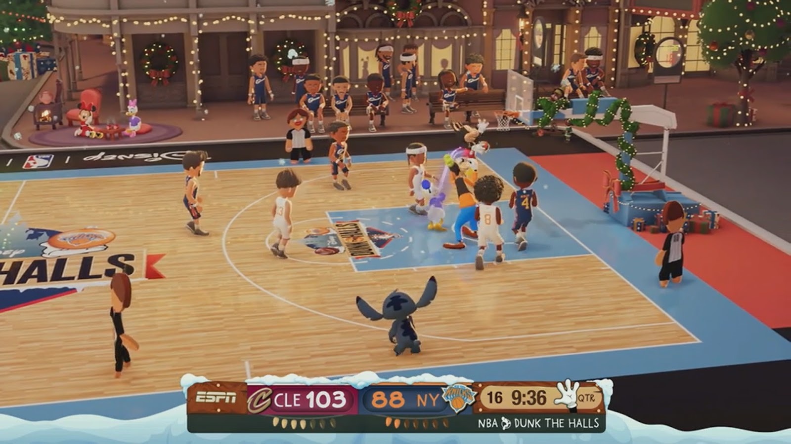 Another break followed, with humorous footage of Santa’s elves getting together to form what appeared to be a Christmas tree. When the scene finally reset with 7:50 left in the quarter, the score stood at CLE 41, NYK 38 — the Knicks having gone on an impressive run during the broadcast issues, but the visuals seemed to be in good form again. We didn’t have any further disruptions of such length, but we also didn’t get to experience whatever hijinks they had planned for Stitch as the basketball, because that particular story element wasn’t attempted again.