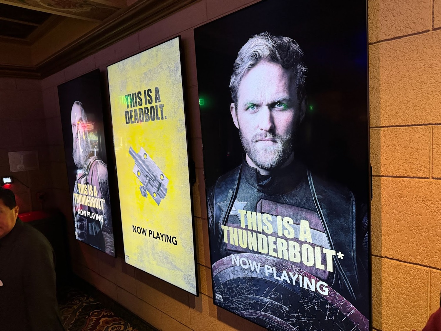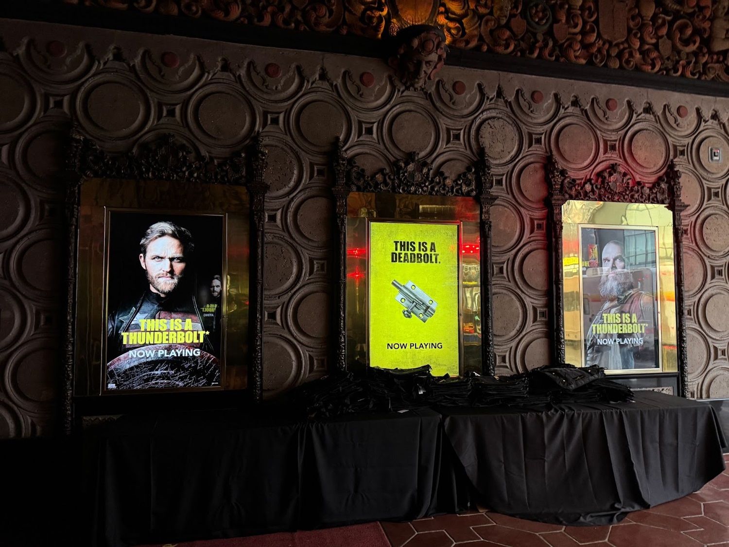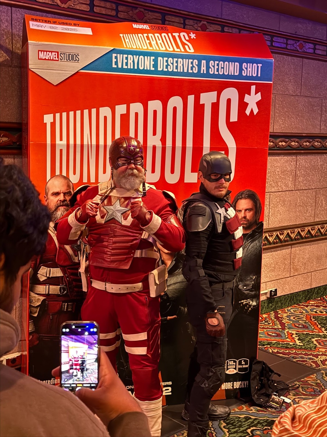 - The theater also had two dedicated photo ops, with a poster standee as well as a Thunderbolts* cereal box photo op.
