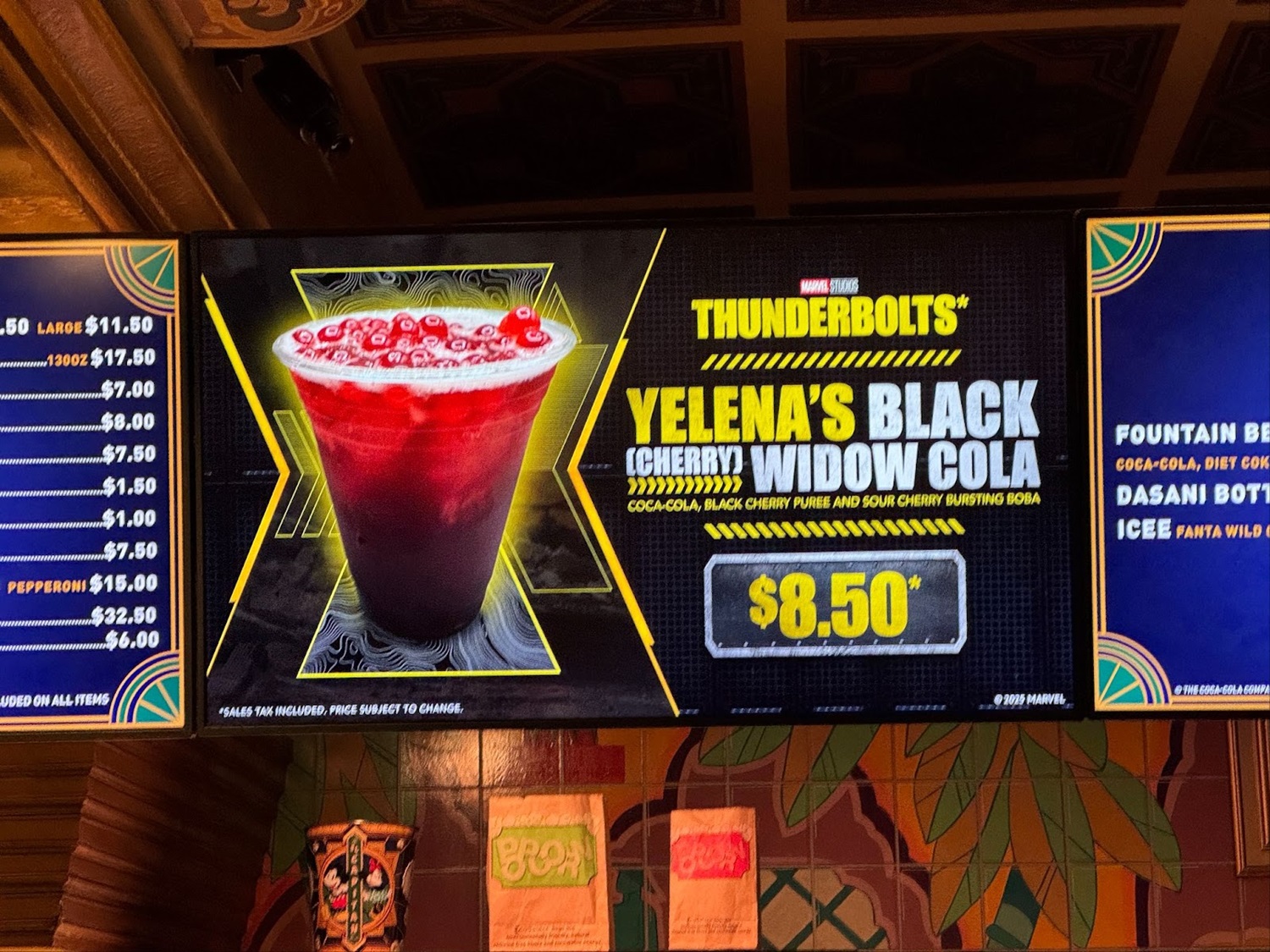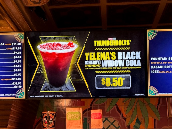 - Yelena’s Black (Cherry) Widow Cola: Coca-Cola, black cherry puree, and sour cherry bursting boba.