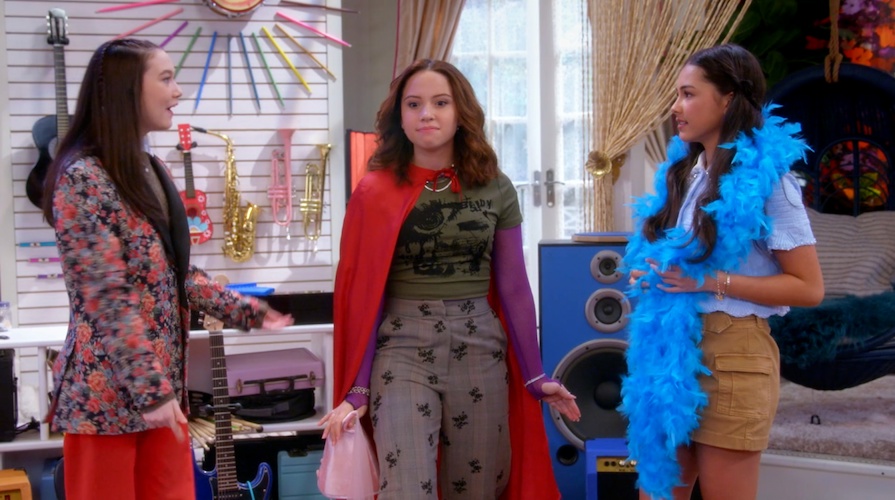 Posey (Lumi Pollack), Jade (Carmen Sanchez), and Tulip (Ruby Marino) pick out costume pieces for auditions for the school musical in Tulip’s music room. It’s a show Tulip loves called “Hazel Sloan: Boss Girl CEO Princess," and they all discover at the same time that they each want the lead role.