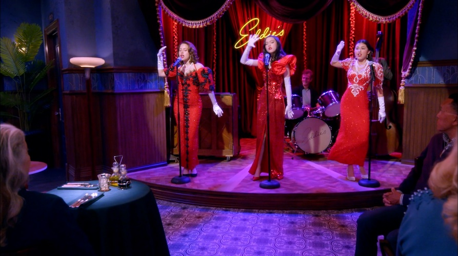 At rehearsal, Posey, Jade, and Tulip are all distracted by their phones, doomscrolling. Posey decides they need a break, suggesting they go somewhere fun with poor cell service. Tulip knows just the place - Eddie’s, a jazz club known for their soup where the trio are the youngest patrons by decades. Tulip is such a frequent guest that the owner, Eddie (Bruno Amato), knows her by name. He laments that there won’t be music tonight as his singers didn’t show up. Tulip suggests they perform. They improvise with the band, delivering a jazz interpretation of “No Limits."