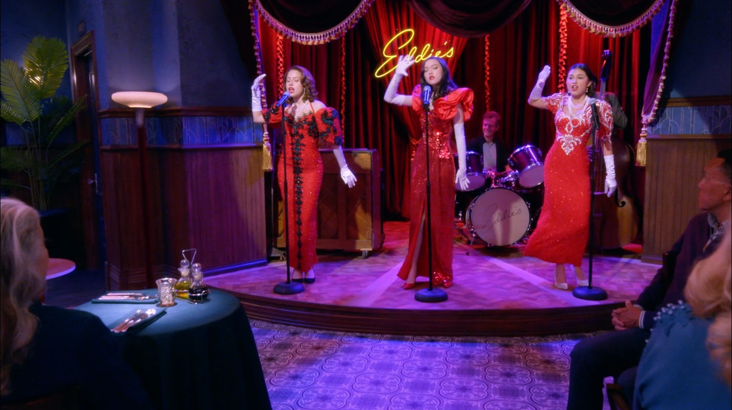 At rehearsal, Posey, Jade, and Tulip are all distracted by their phones, doomscrolling. Posey decides they need a break, suggesting they go somewhere fun with poor cell service. Tulip knows just the place - Eddie’s, a jazz club known for their soup where the trio are the youngest patrons by decades. Tulip is such a frequent guest that the owner, Eddie (Bruno Amato), knows her by name. He laments that there won’t be music tonight as his singers didn’t show up. Tulip suggests they perform. They improvise with the band, delivering a jazz interpretation of “No Limits."