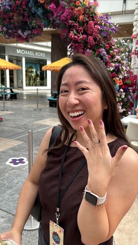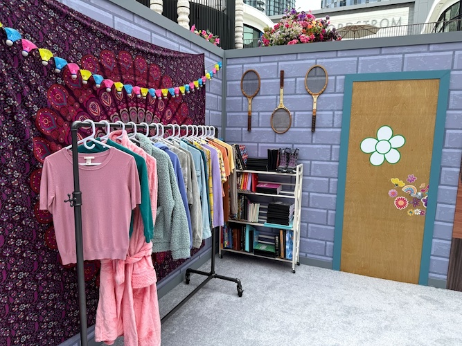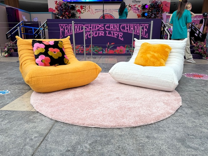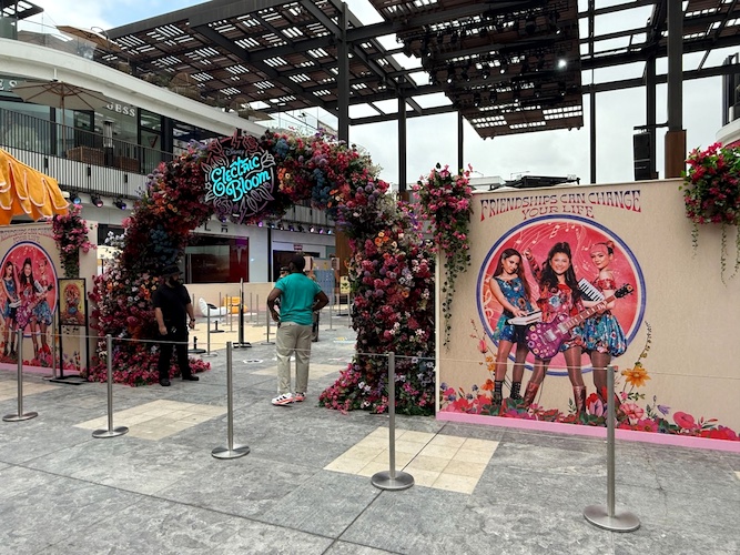A wide-open area of the popular outdoor mall has been transformed into a colorful celebration of Electric Bloom, a new show that debuted on Disney Channel over the summer. The show follows the three members of the now mega-famous pop group Electric Bloom as they look back and tell the story of their band and friendship, starting with the day they all met in high school.