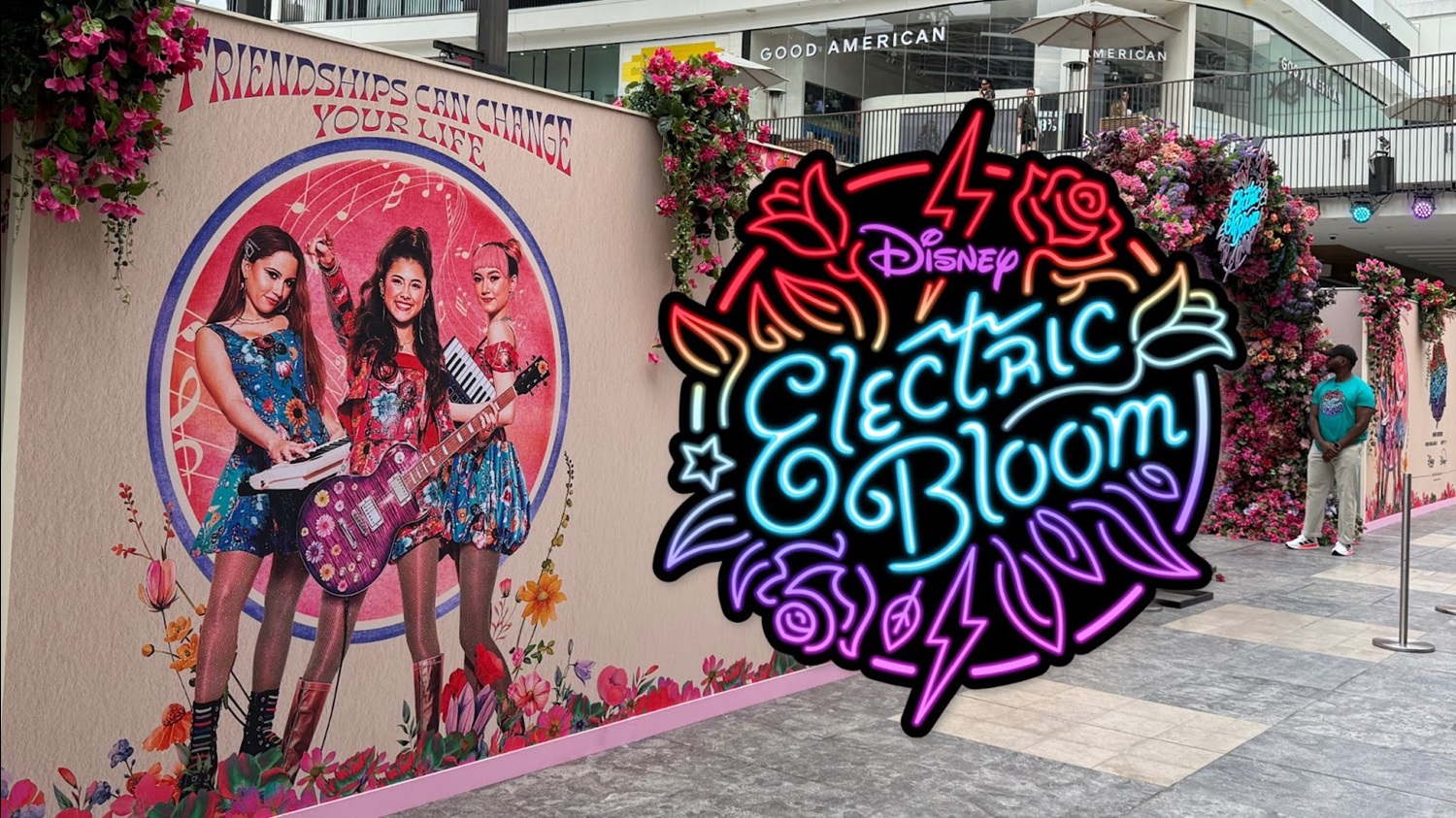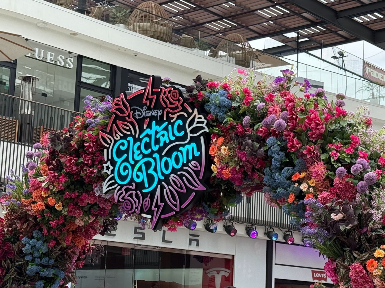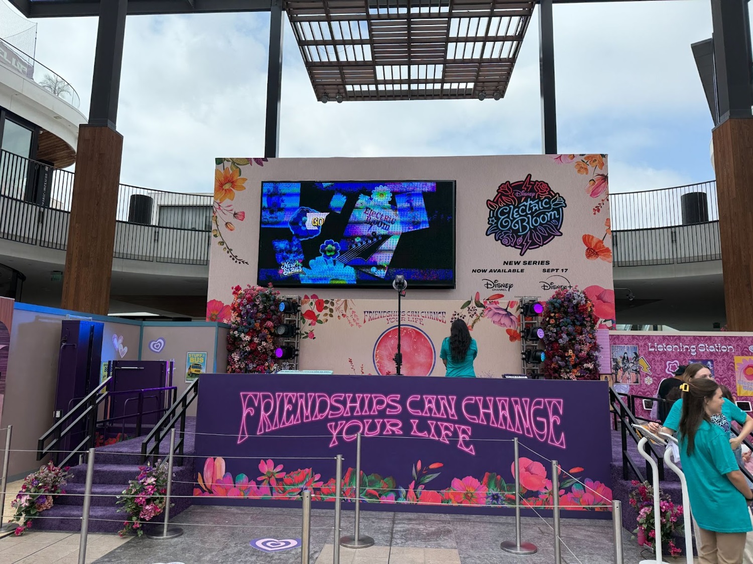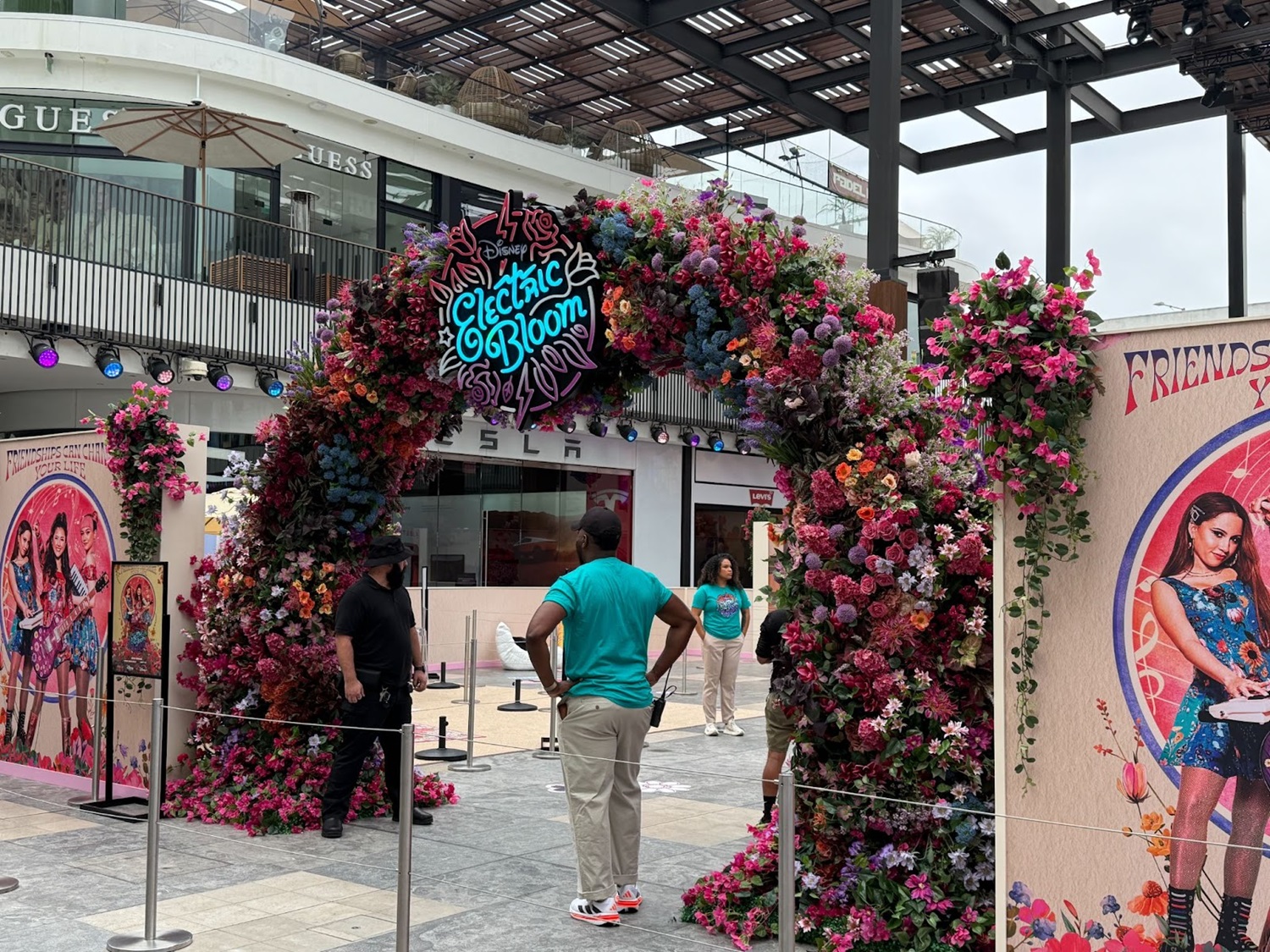 A wide-open area of the popular outdoor mall has been transformed into a colorful celebration of Electric Bloom, a new show that debuted on Disney Channel over the summer. The show follows the three members of the now mega-famous pop group Electric Bloom as they look back and tell the story of their band and friendship, starting with the day they all met in high school.
