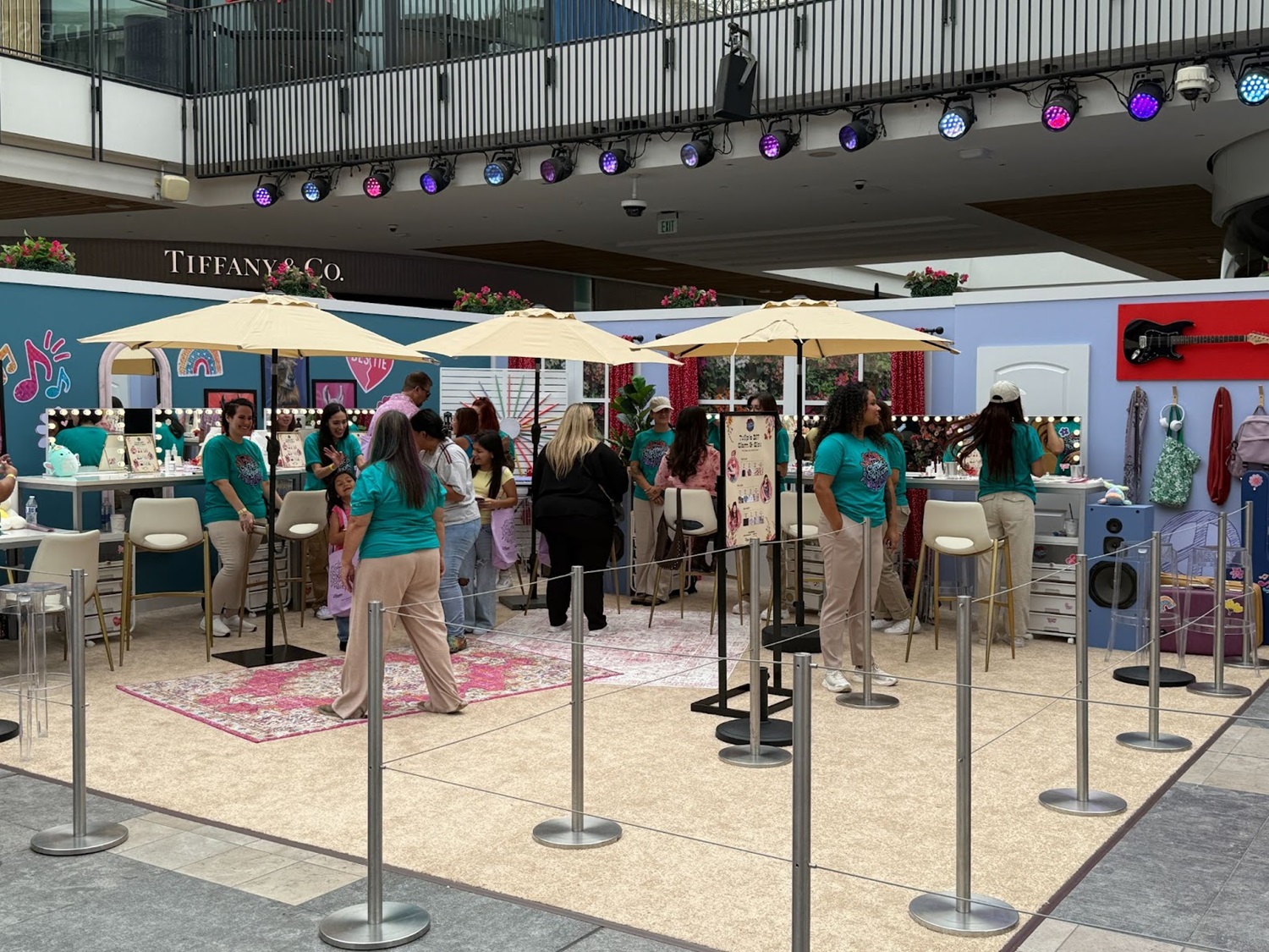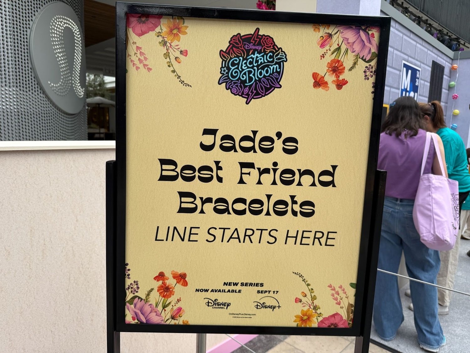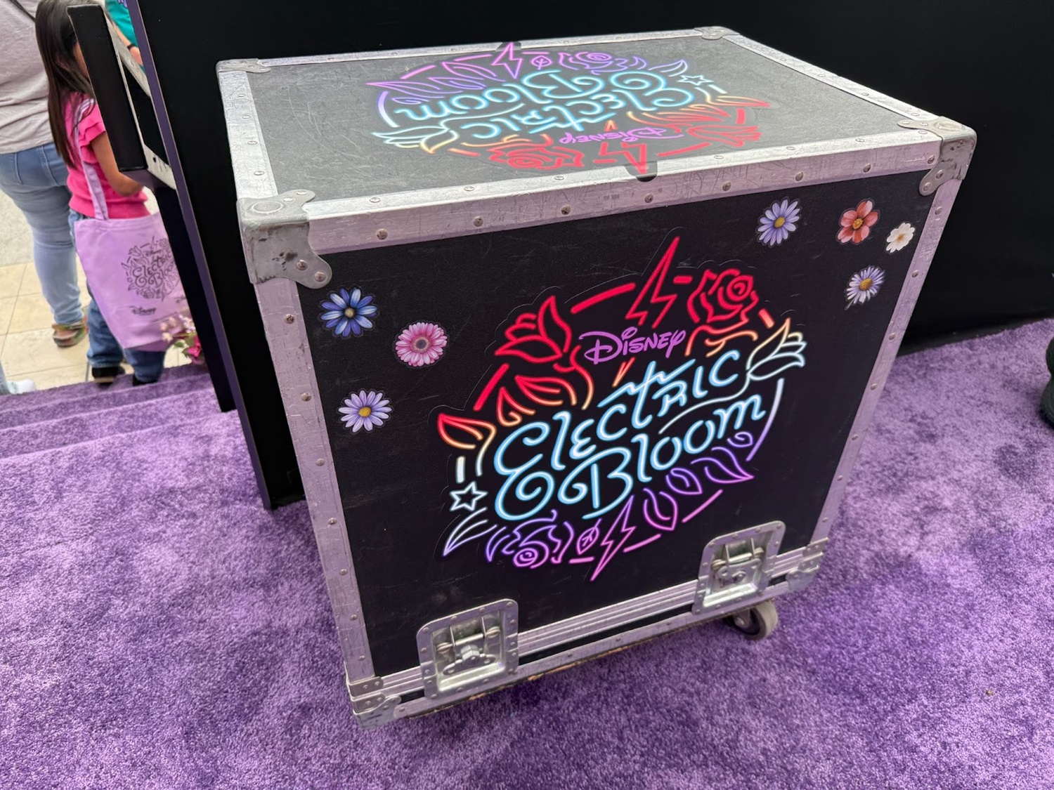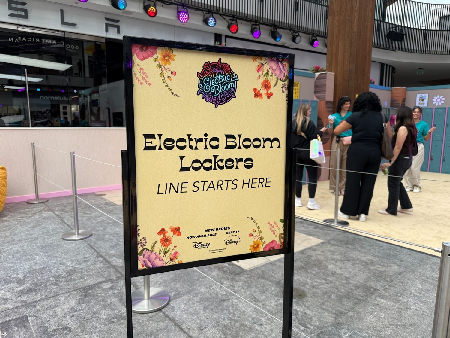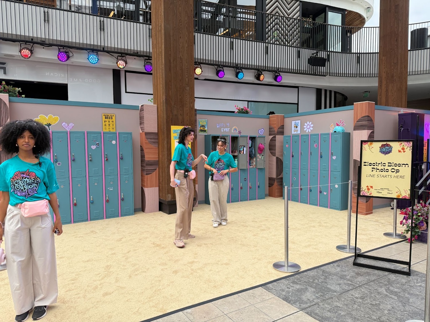 A wide-open area of the popular outdoor mall has been transformed into a colorful celebration of Electric Bloom, a new show that debuted on Disney Channel over the summer. The show follows the three members of the now mega-famous pop group Electric Bloom as they look back and tell the story of their band and friendship, starting with the day they all met in high school.