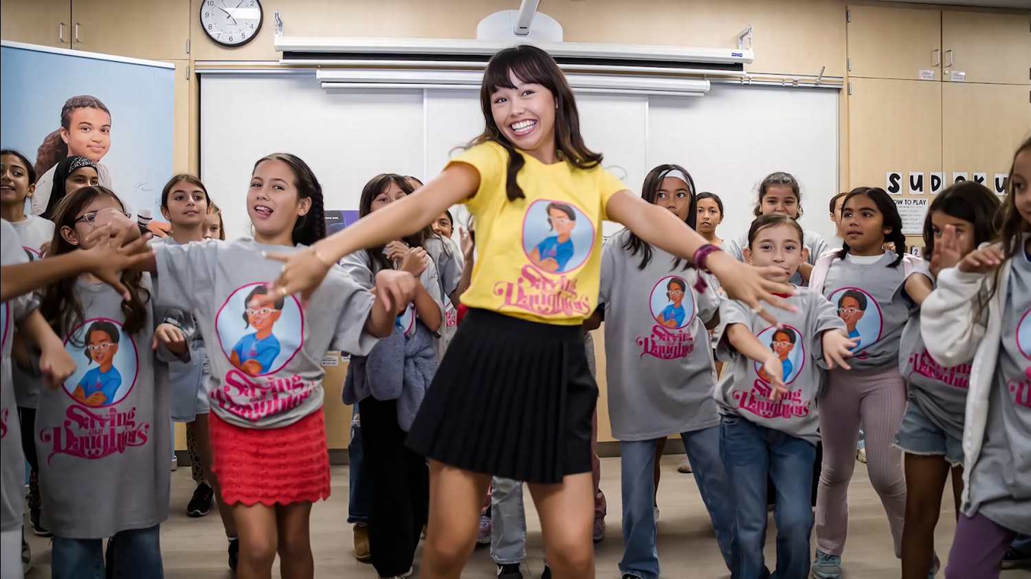 - Sporting a Saving Our Daughters shirt alongside the students, the young actress had a fang-tastic time teaching the class the “Fangfoot Stomp."