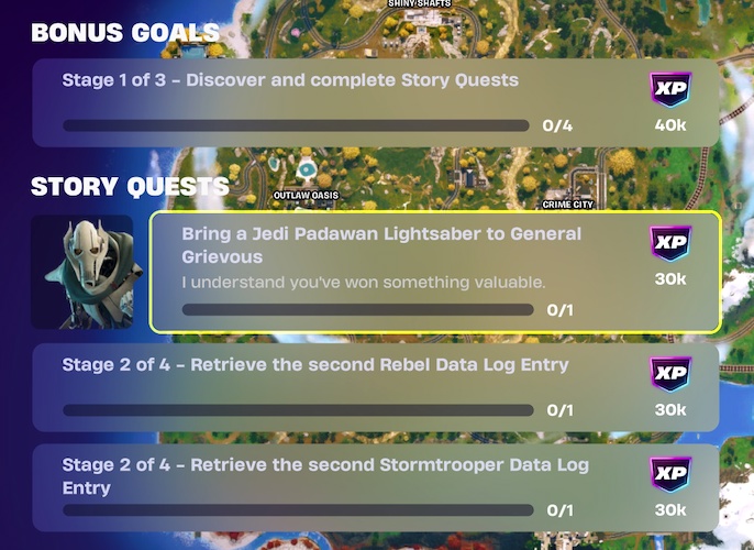 Something really interesting about this new season is Story Quests are far more obscure than in previous seasons. It relies on players getting onto the island and exploring. Make sure you keep an eye out for “!" markers on your map, as they often lead to hidden quests and characters. Towards the middle of the island, I ran into General Grievous, who was rather rude to me. However, the conversation unlocked a quest for the character, requiring me to bring him a lightsaber. Galactic Battle really encourages players to go out and find challenges and adventures.