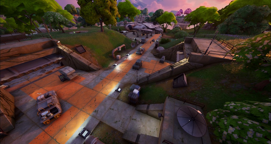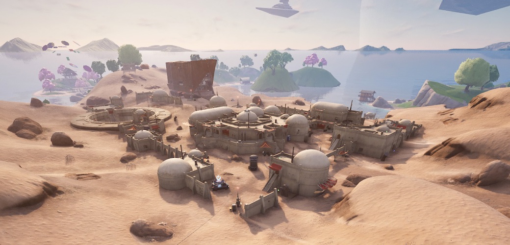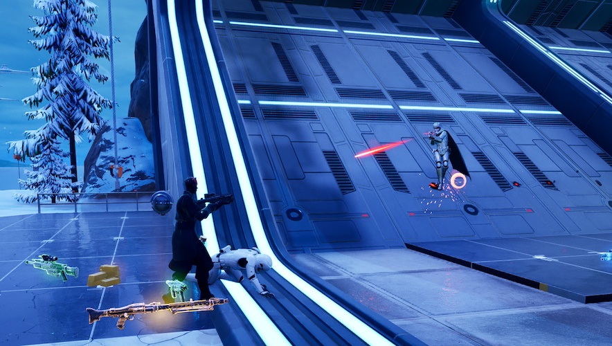 Loading into the game, Star Wars fans will be welcomed with an exciting cinematic as well as a themed lobby for the season. As the Galactic Empire has now invaded Fortnite’s Battle Royale island, all weapons have been replaced with blasters, lightsabers, and other Star Wars-themed items. Standard healing and shield items are still available. Star Wars can be felt everywhere on the map, including in the sky where a large Death Star looms from outer space.
