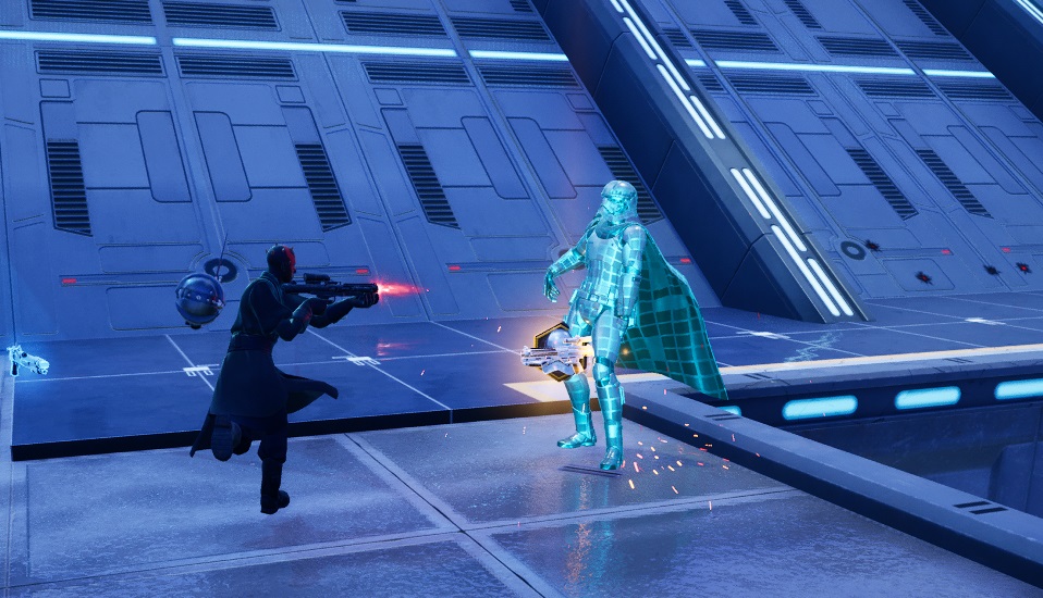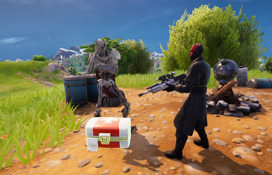 Loading into the game, Star Wars fans will be welcomed with an exciting cinematic as well as a themed lobby for the season. As the Galactic Empire has now invaded Fortnite’s Battle Royale island, all weapons have been replaced with blasters, lightsabers, and other Star Wars-themed items. Standard healing and shield items are still available. Star Wars can be felt everywhere on the map, including in the sky where a large Death Star looms from outer space.