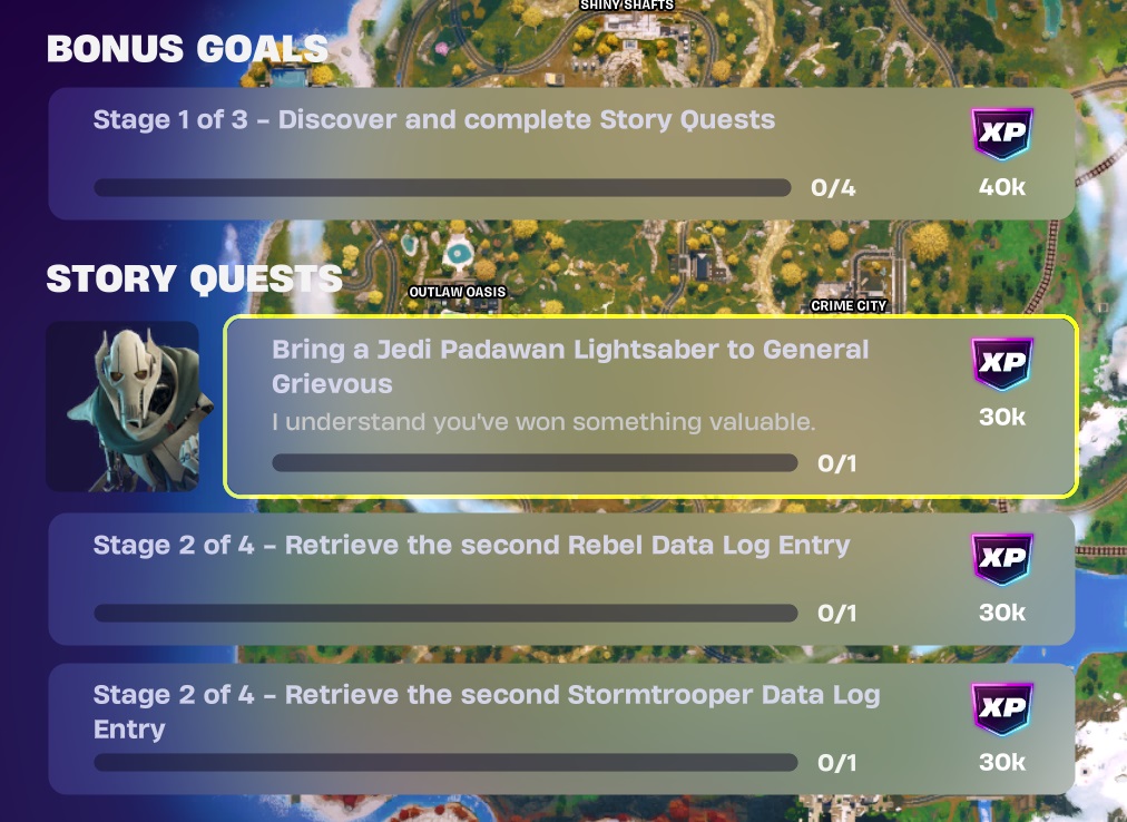Something really interesting about this new season is Story Quests are far more obscure than in previous seasons. It relies on players getting onto the island and exploring. Make sure you keep an eye out for “!" markers on your map, as they often lead to hidden quests and characters. Towards the middle of the island, I ran into General Grievous, who was rather rude to me. However, the conversation unlocked a quest for the character, requiring me to bring him a lightsaber. Galactic Battle really encourages players to go out and find challenges and adventures.