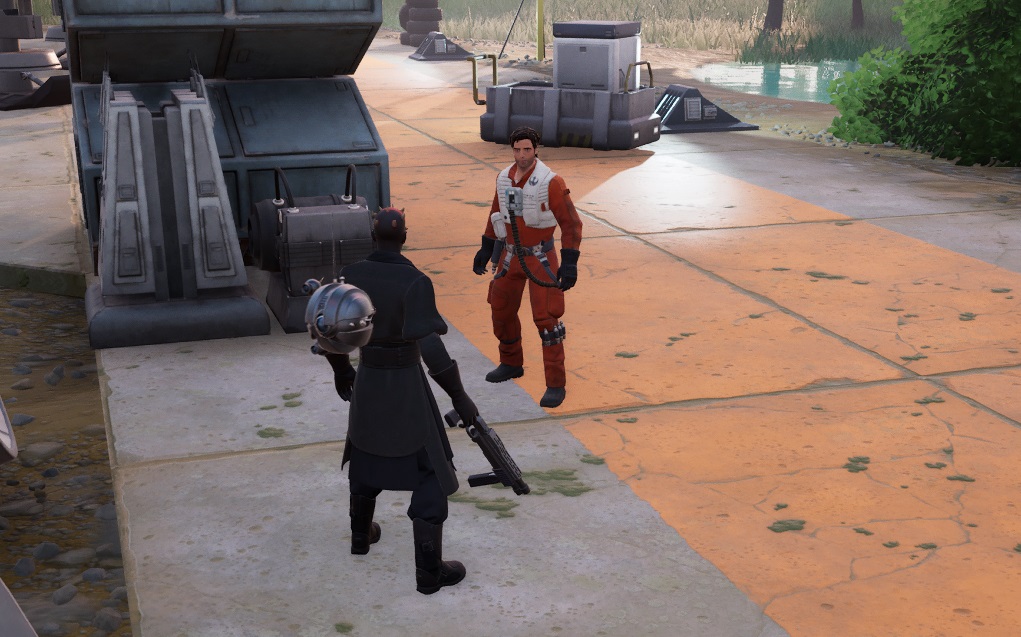 Featuring the iconic Millennium Falcon, X-Wings, and Poe Dameron, there are plenty of bunkers and crates to explore. Finding a handful of different blasters, I loaded up my loadout and headed to go talk with Poe who gave me a rundown on the area and the battle.