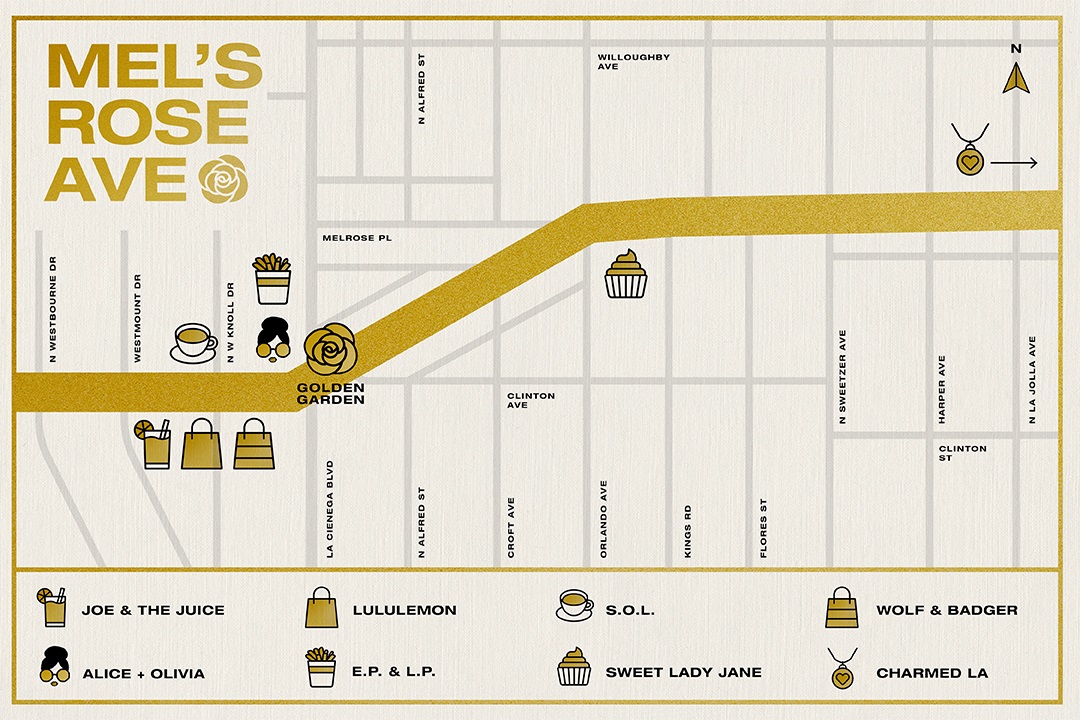 - The iconic street will transform into Mel's Rose Avenue, where your first stop will be the Golden Garden, on the corner of La Cienega Blvd & Melrose Ave, where you can grab a Mel's Rose Avenue map – the key to unlocking special offers and discounts from beloved local restaurants and retailers.