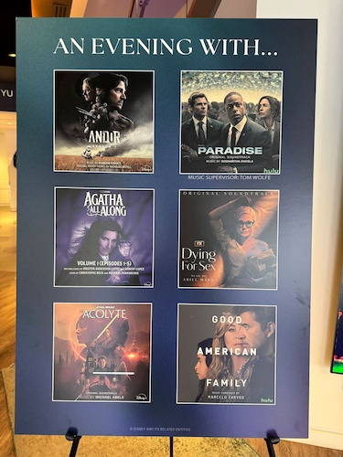 The moderator for the event was Vice President of the Guild of Music Supervisors Heather Guibert, and the participants included composers Michael Abels (Disney+’s Star Wars: The Acolyte), Brandon Roberts (Disney+’s Andor: A Star Wars Story), Ariel Marx (FX On Hulu’s Dying for Sex), Marcelo Zarvos (Hulu’s Good American Family), Christophe Beck & Michael Paraskevas (Disney+’s Agatha All Along), plus music supervisor Tom Wolfe (Hulu’s Paradise). It kicked off with a clip reel and discussion of The Acolyte, for which composer Michael Abels talked about staying within the “sonic universe" of Star Wars while bringing his own unique style to the show. “Everyone loves Star Wars in their own way. In the case of our show, it’s got all original characters, but it still needs to feel familiar– it needs to feel like that world. The music was going to be one way in which it felt like the Star Wars world. In each scene, I would start by saying, ‘How Star Wars-y is this?’"