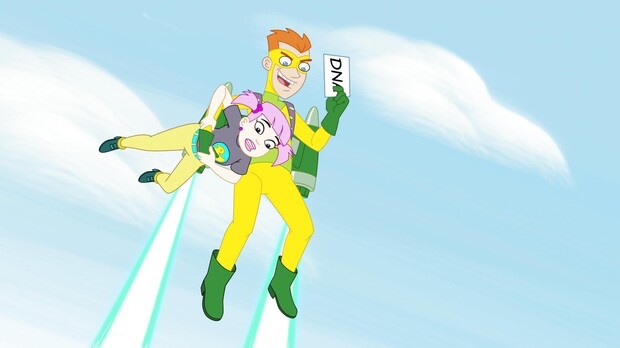 Ms. Knight then reveals herself to be The Imposter, who has been spending months (and most of this season really) trying to learn the identities of the heroes that have constantly defeated him. Now that he knows, he plans to expose their secret on the 3:00 news. Because everybody watches the 3:00 news. As Hiromi runs to warn Kevin, The Imposter takes her away, and reveals a complicated plan (with The Dark Knight vibes) that sees dummy versions of Hiromi scattered throughout town and in danger. That way, Hamster and Gretel must save each of them and spend that time doing that instead of stopping The Imposter. Here’s the thing, each of these is a fake. Fred, Hamster, Gretel, and Bailey are racing to find the real Hiromi, but they’re all frauds. One of these was located in a department store, crashing into a shelf of industrial strength molasses, trapping everyone. Super powers are apparently no match for industrial strength molasses. Who knew?