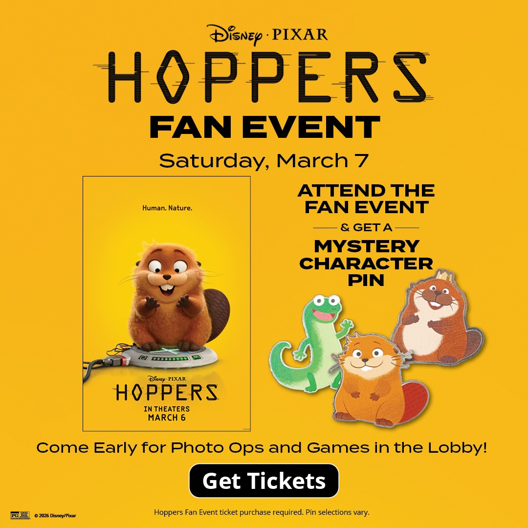 Marcus Theaters will be hosting a special fan event for Hoppers on Saturday, March 7. For those who attend the event, they will receive a mystery character pin, featuring Mabel, King George, or Tom Lizard. Additionally, games and photo ops will be featured in the lobby.