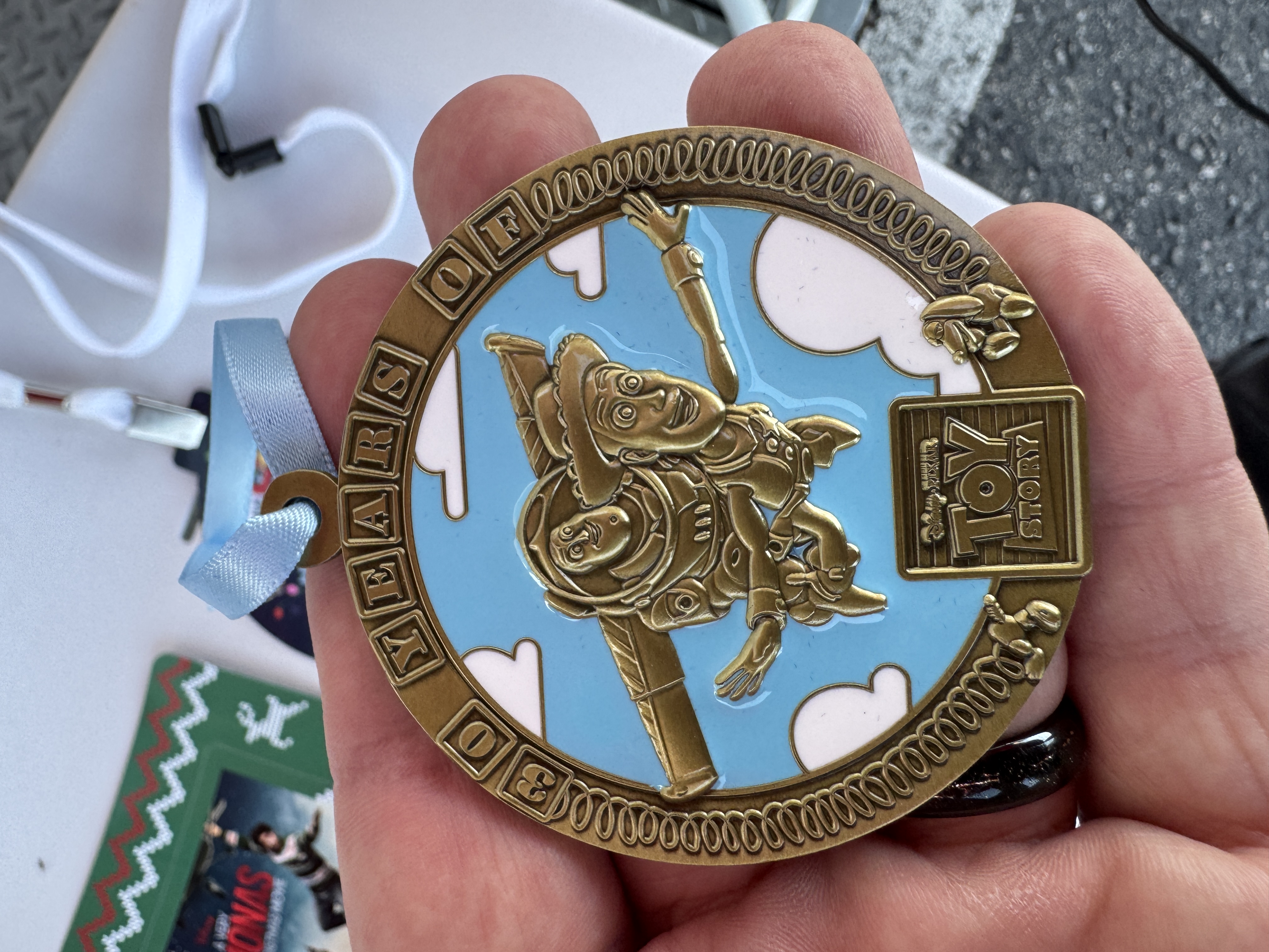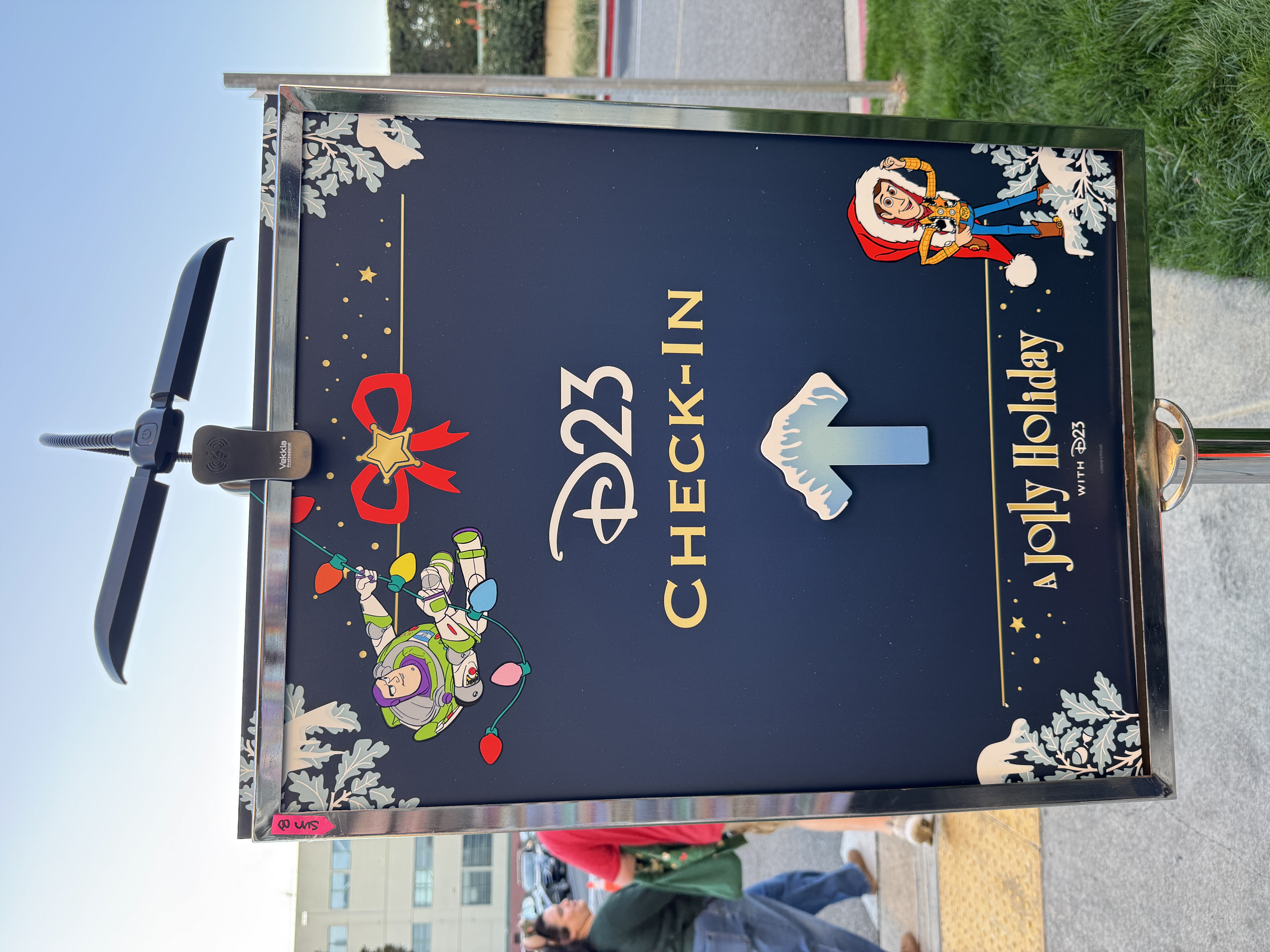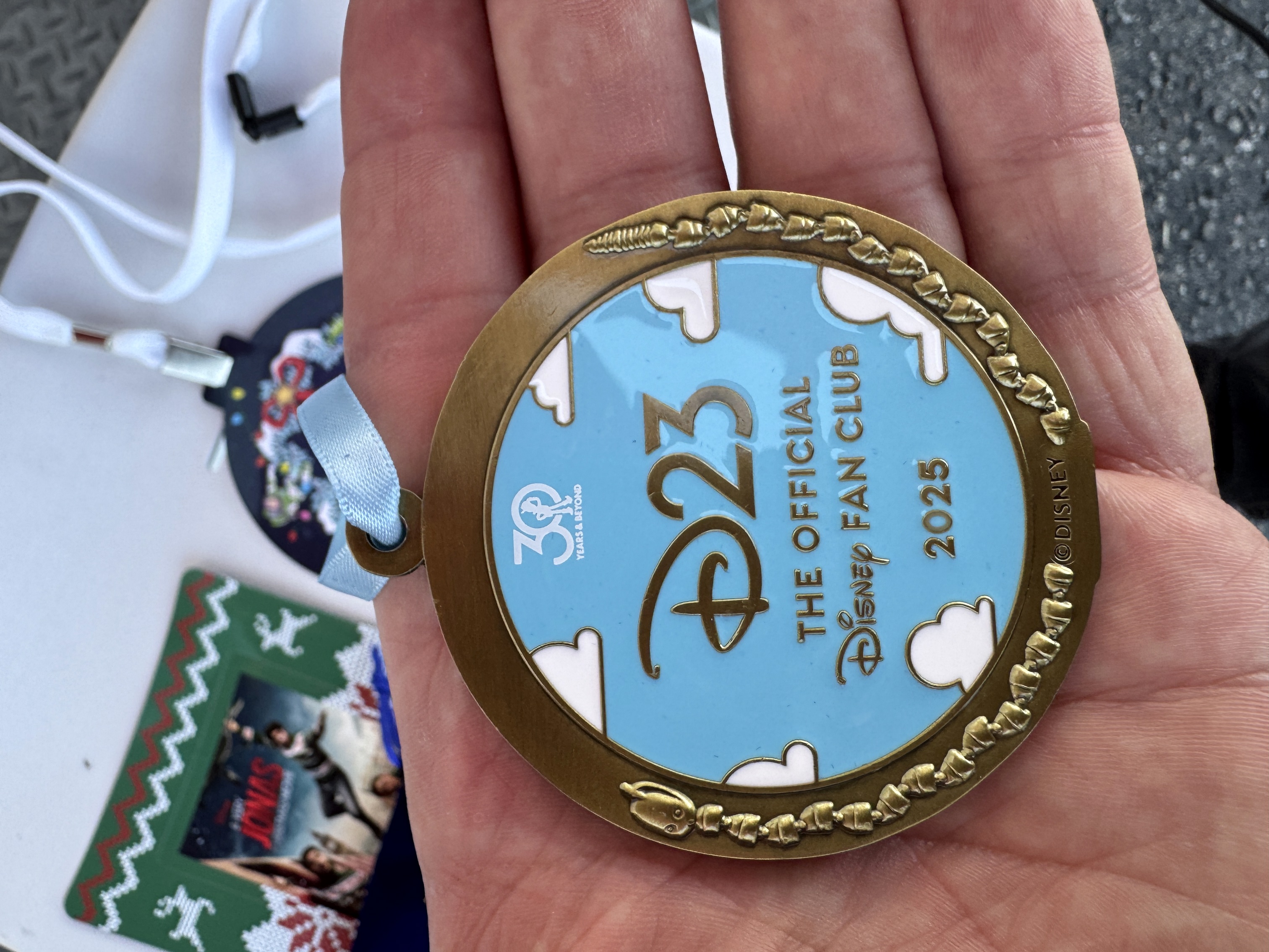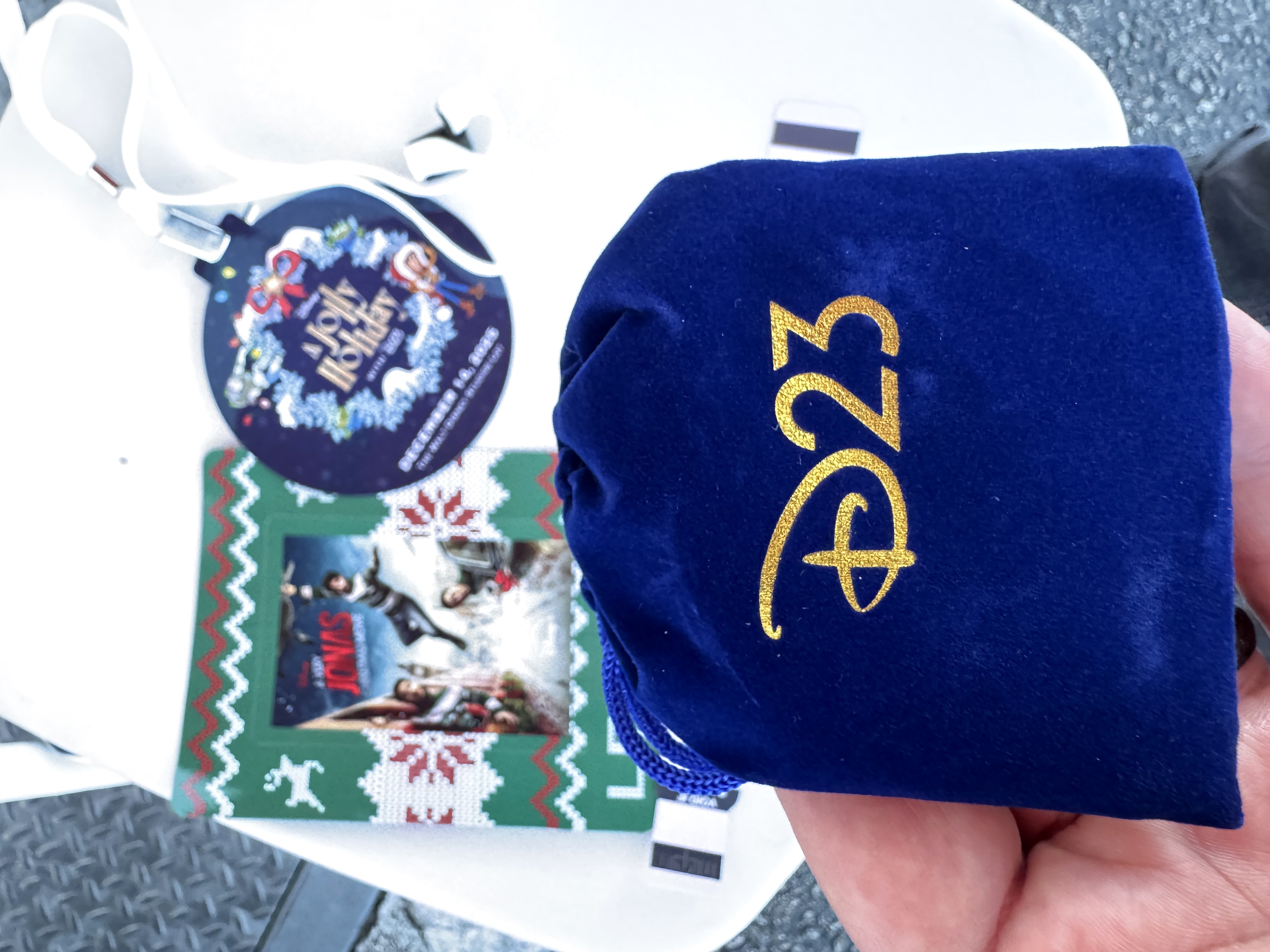 Upon checking in, I received some swag included with the price of admission, which was paid for by Laughing Place: a D23 ornament celebrating the 30th anniversary of Pixar's Toy Story, an event credential, and a magnet frame in promotion of A Very Jonas Christmas Movie on Disney+.