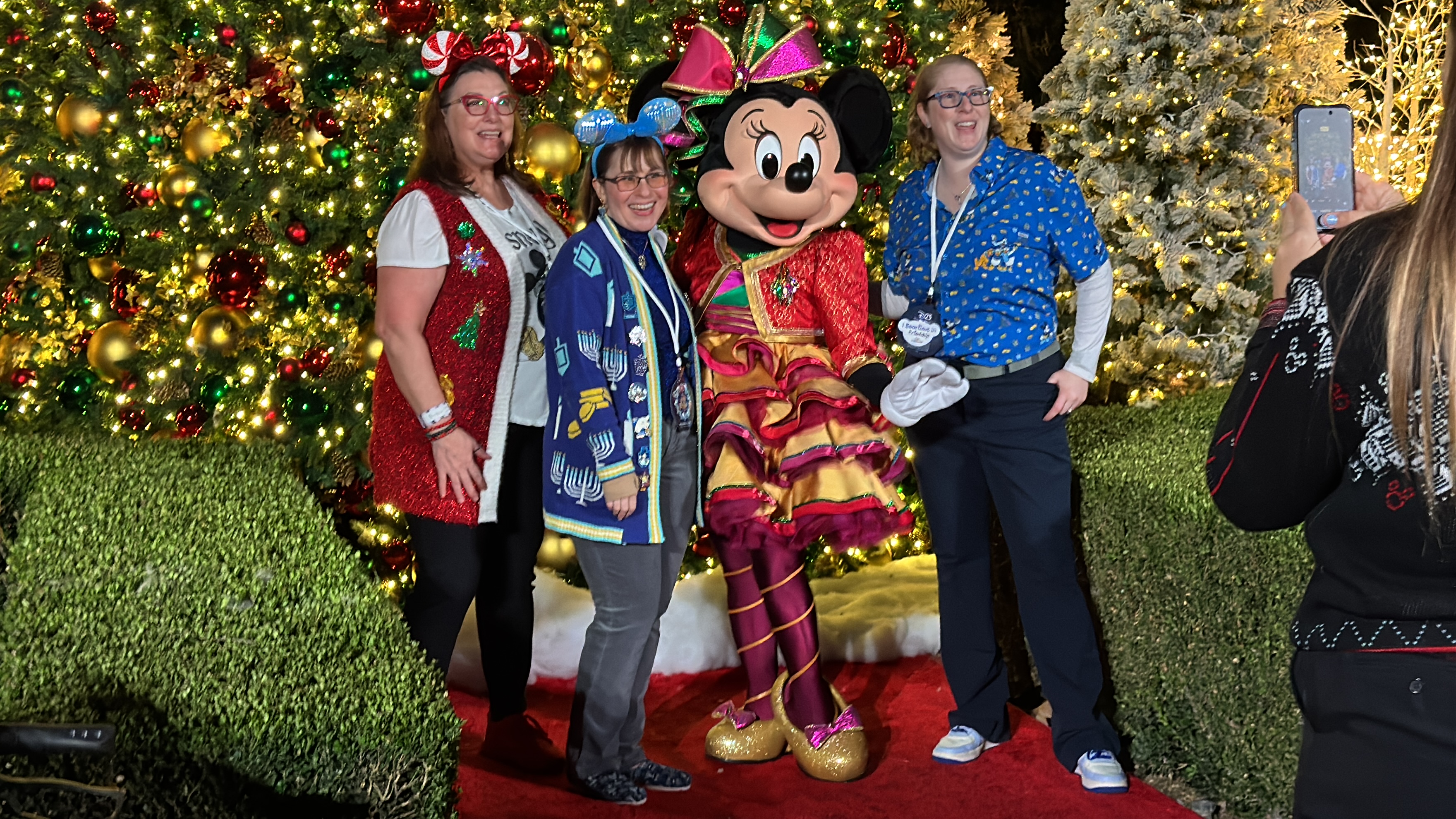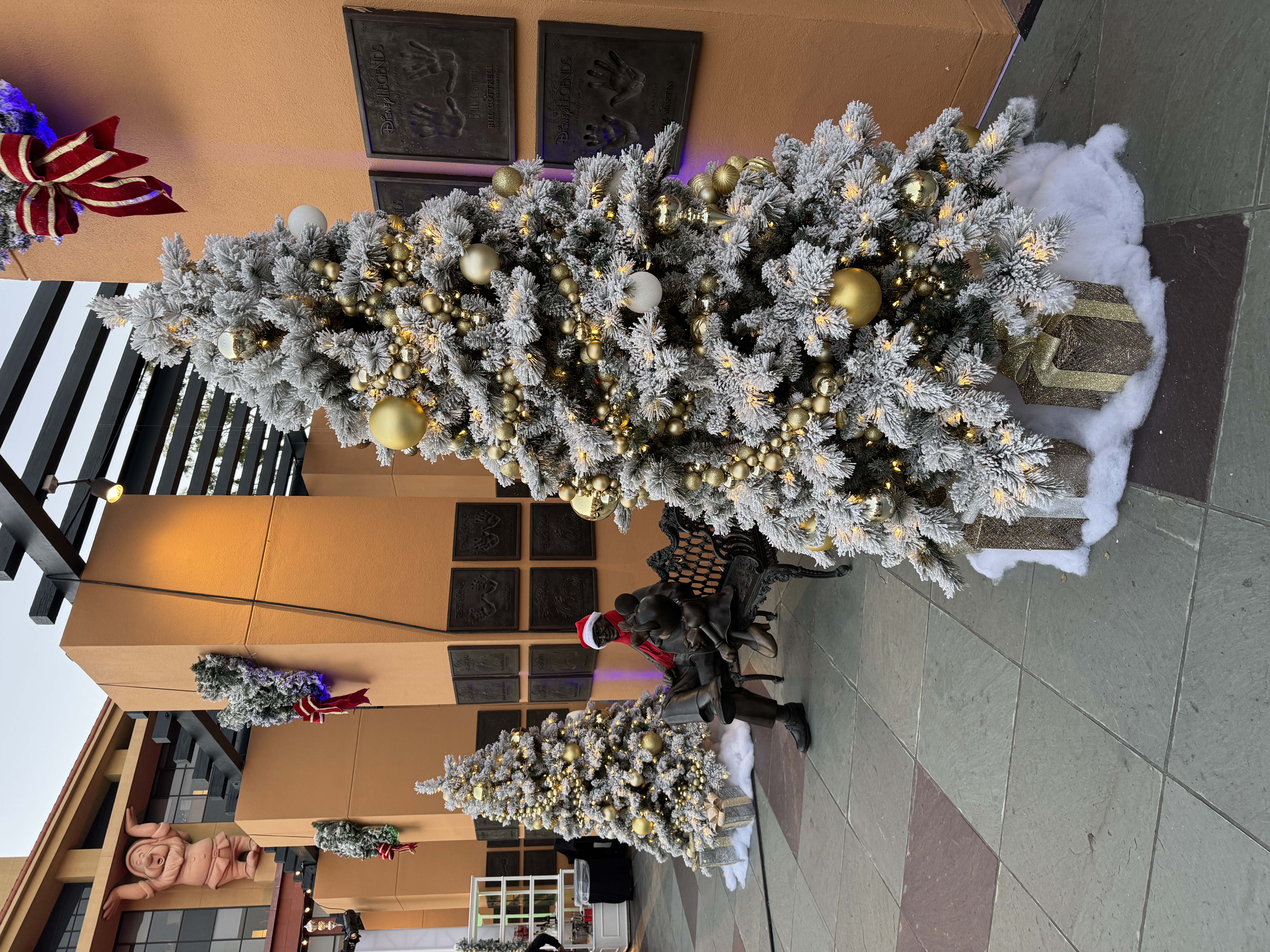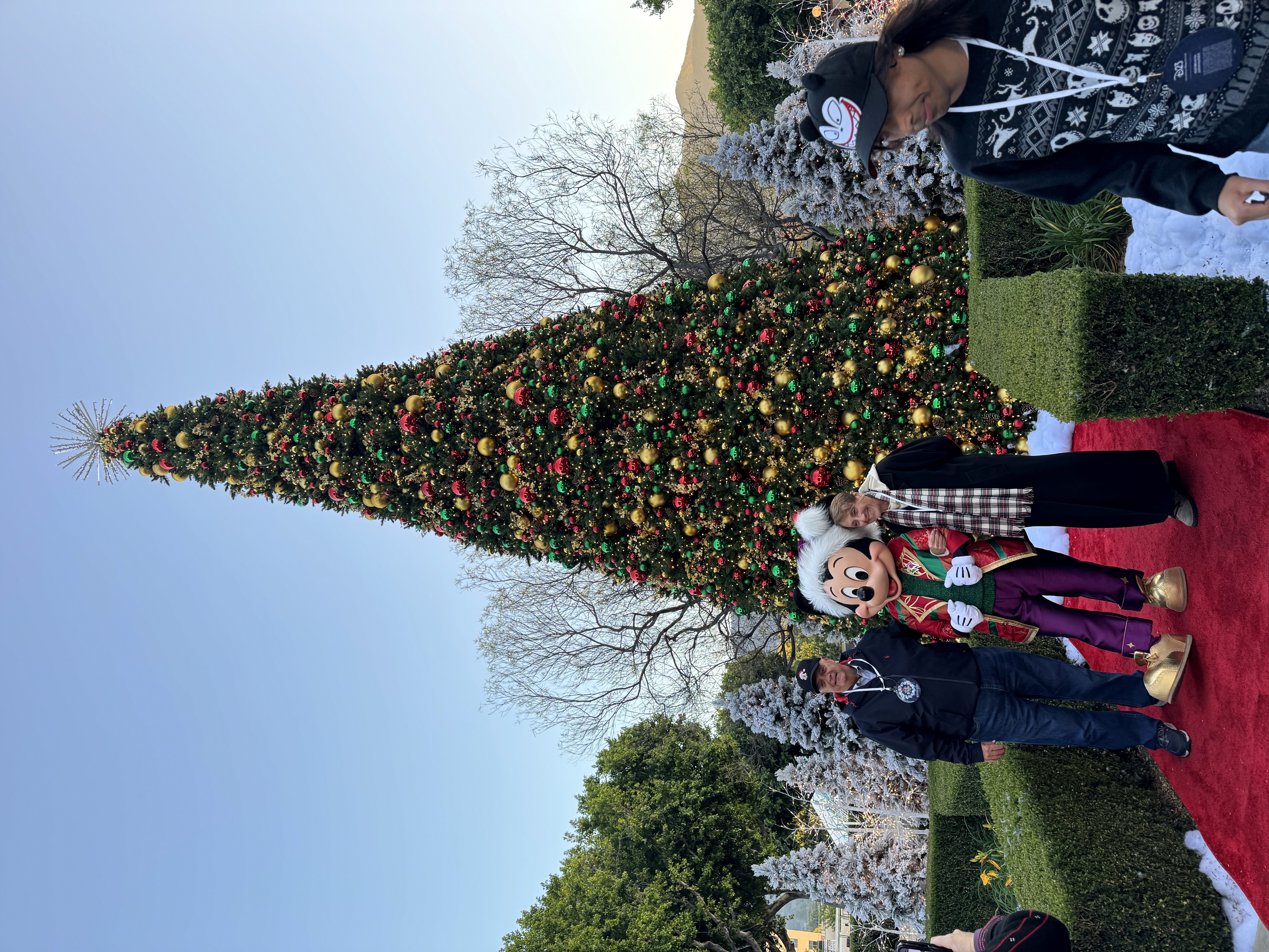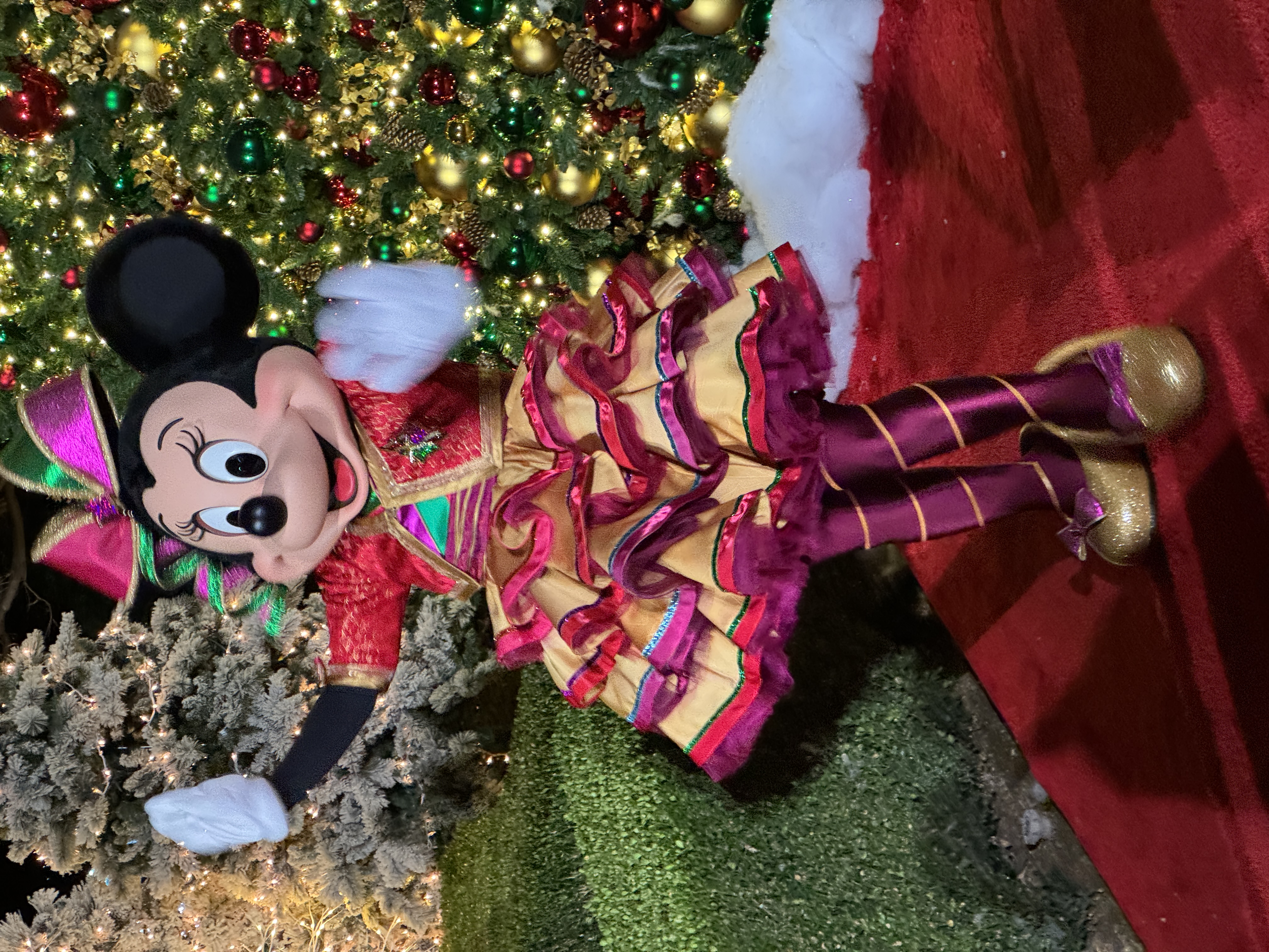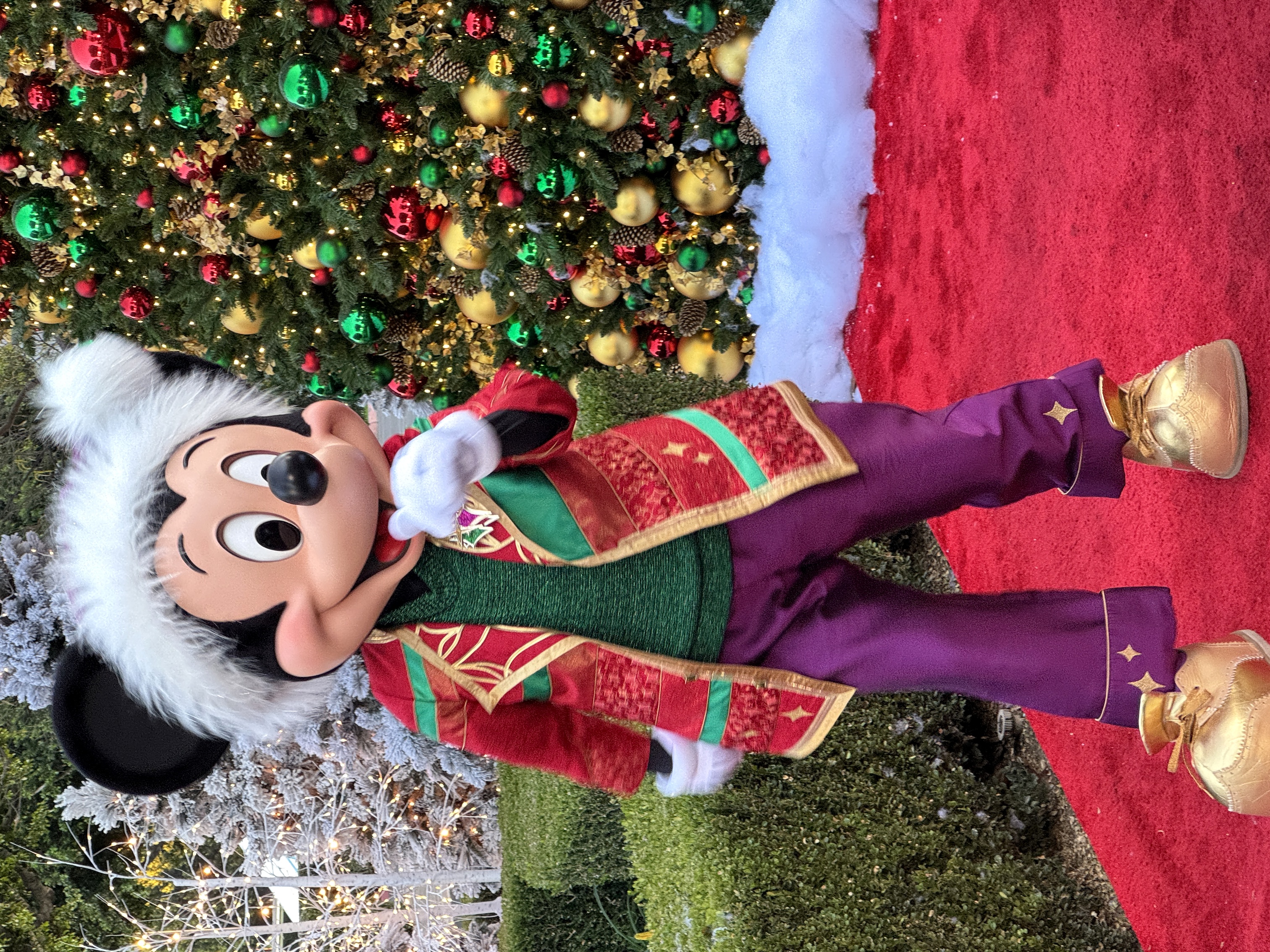 Posing underneath the lot's big Christmas tree was Mickey Mouse, all dressed up for the occasion in appropriate reds and greens.
