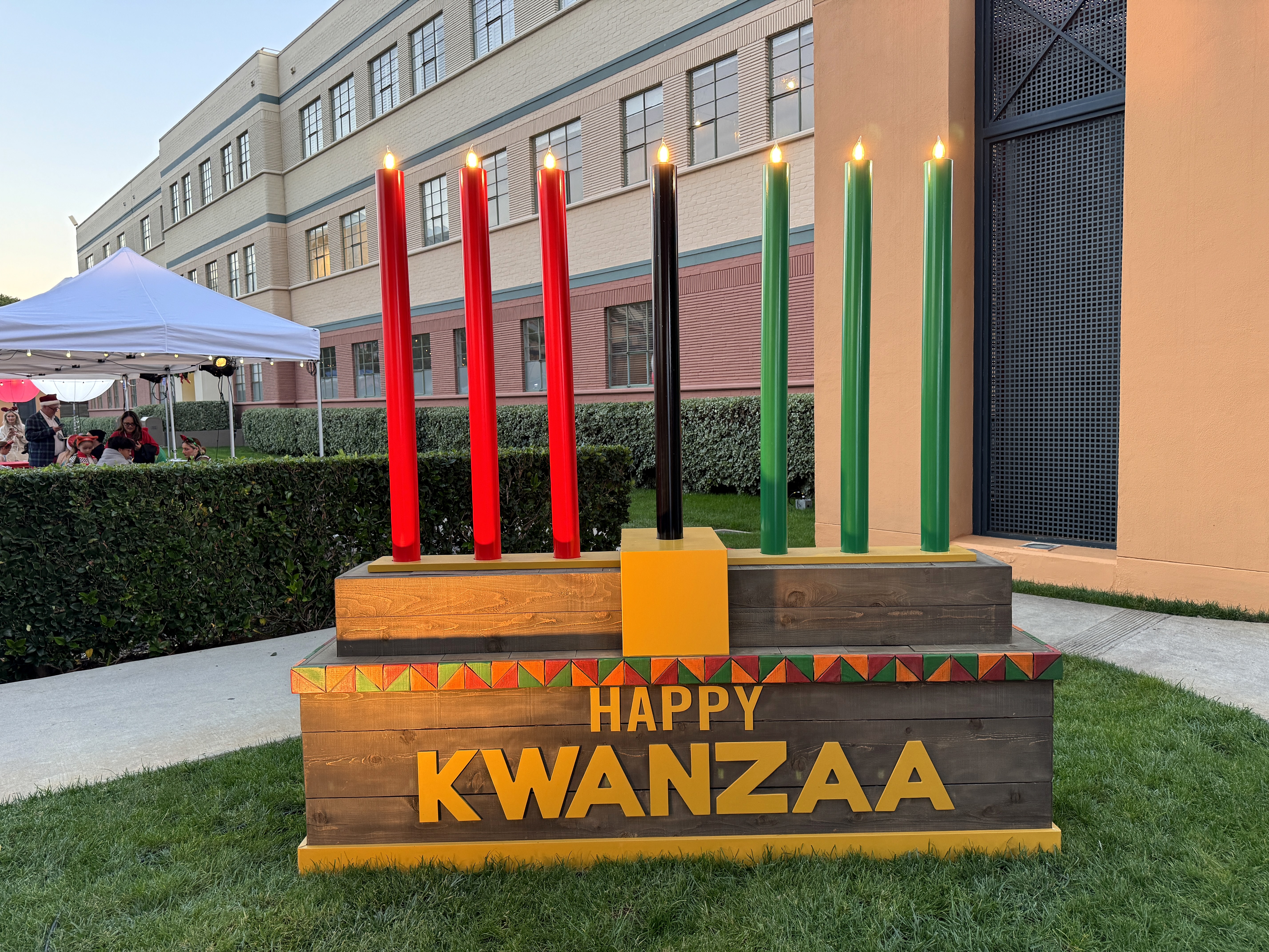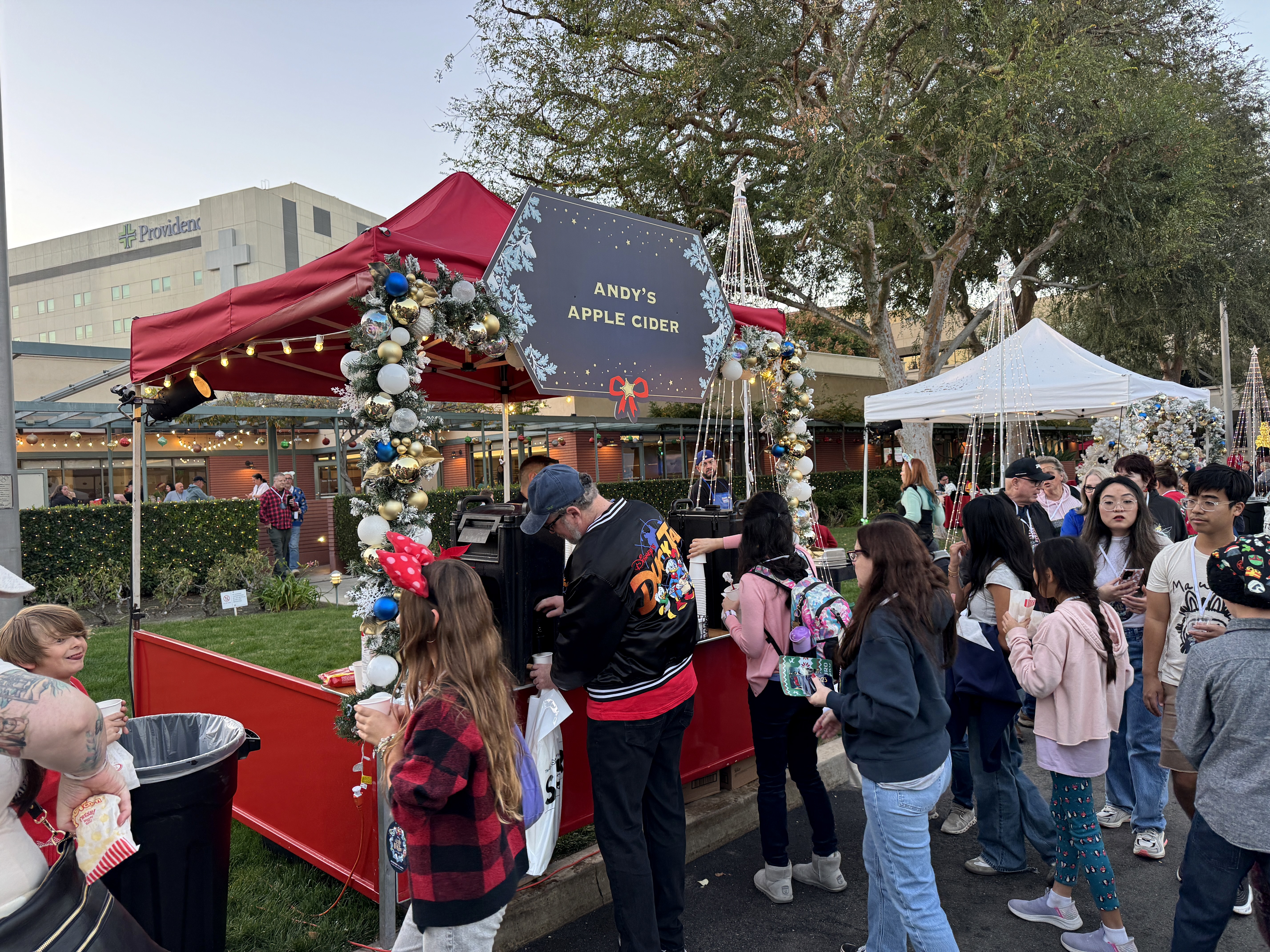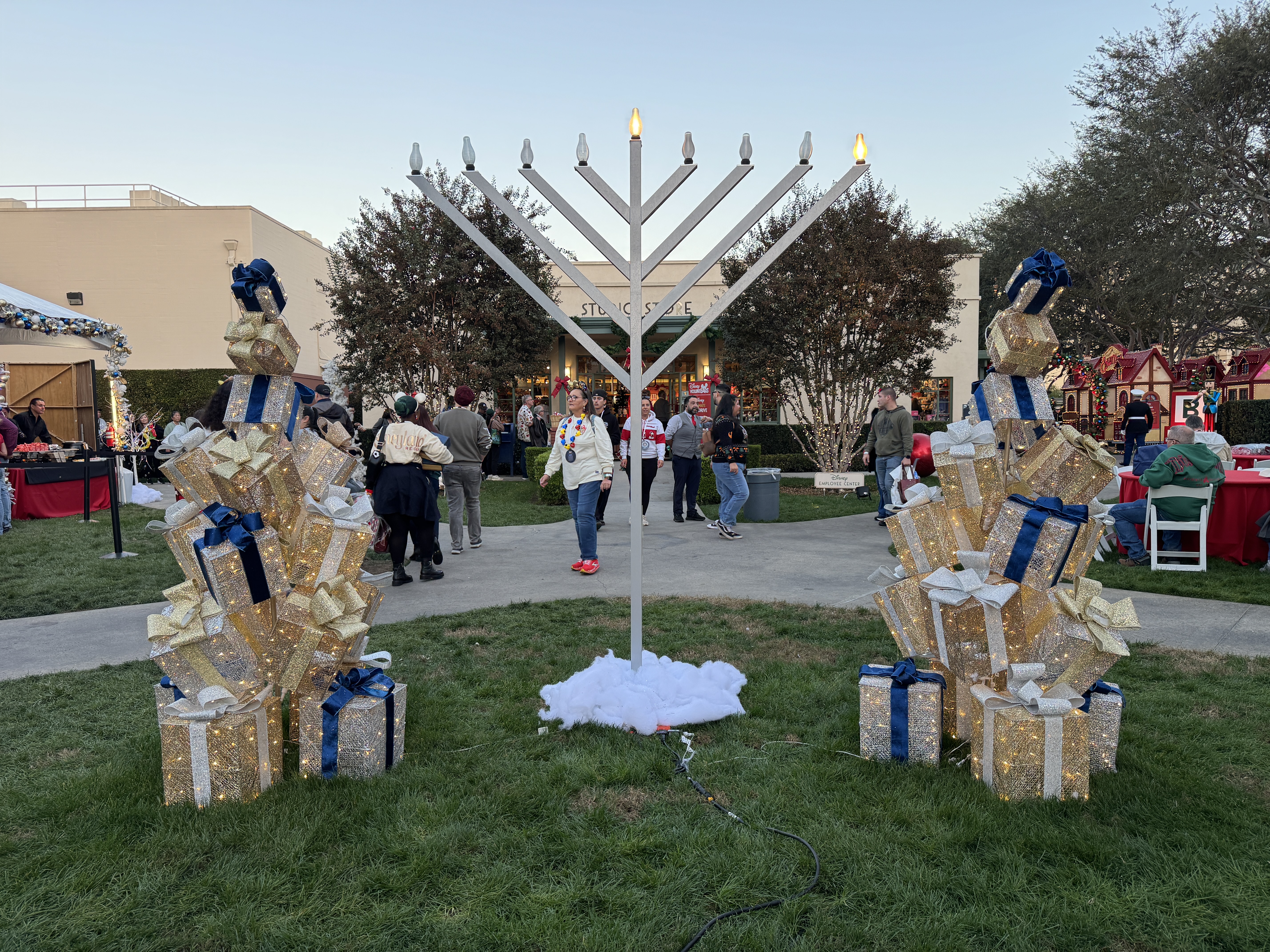Guests could also line up to enter the main Studio Store building, and there were food kiosks, booths, and stands for items like apple cider, cotton candy, popcorn, and hot cocoa, many of which were included with admission. A host on the main stage moderated Disney-themed trivia challenges with various prizes, and other wintertime holidays beyond Christmas were represented in the decor, such as Hanukkah and Kwanzaa.