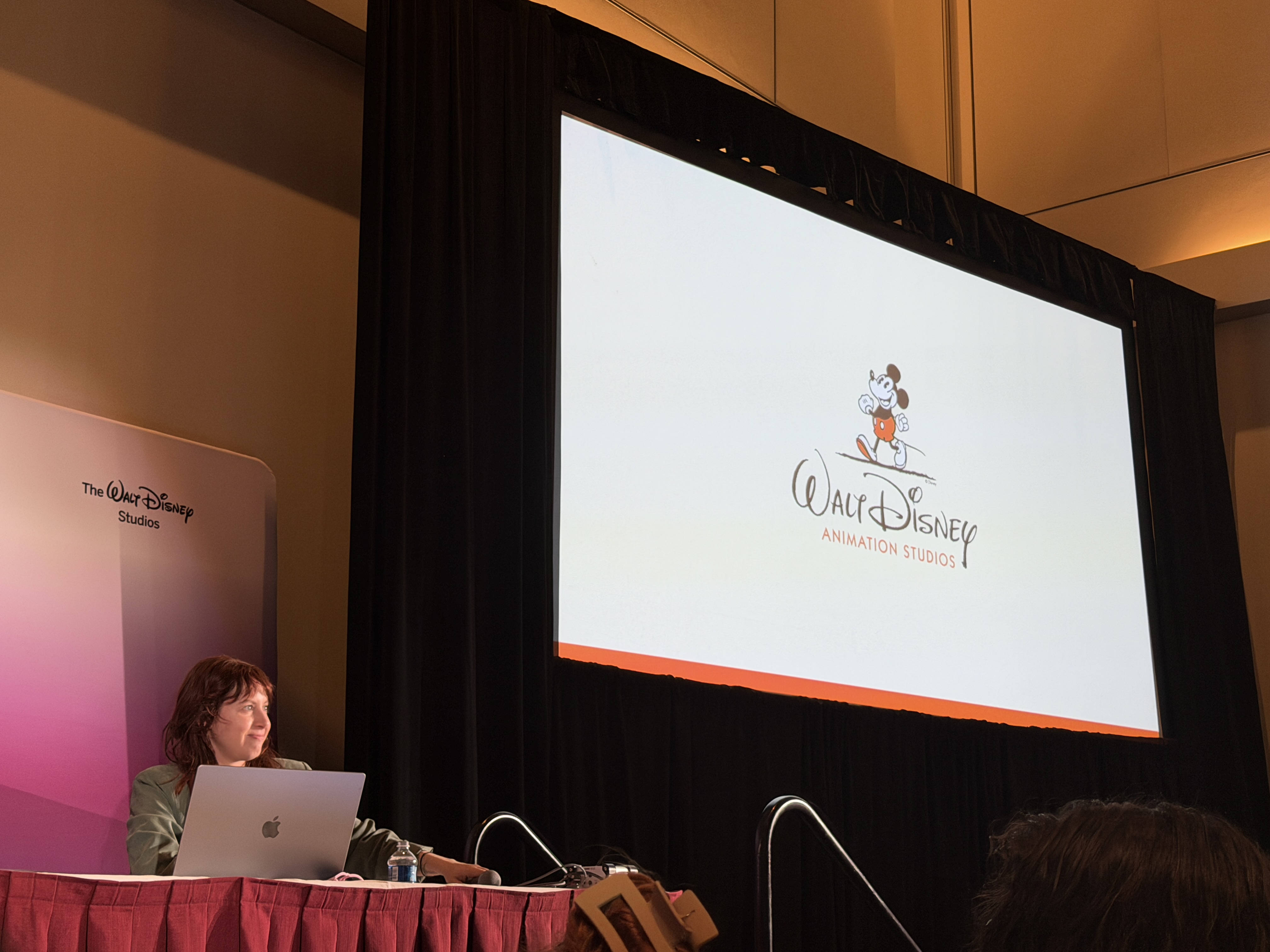 Bradfield opened by reflecting on Disney’s balance of timely and timeless storytelling — always evolving without losing its soul. That philosophy guided her own career, which began not in art school but in the backseat of a car, drawing on road trips while listening to Disney movies recorded onto cassette tapes by her brother. She later designed her own figure-skating costumes with her grandmother before deciding, at fifteen, to leave the rink and enroll in community college. “I’d never been to high school,” she laughed, recalling the nerves of suddenly being around so many people. Art quickly became her bridge to connection.