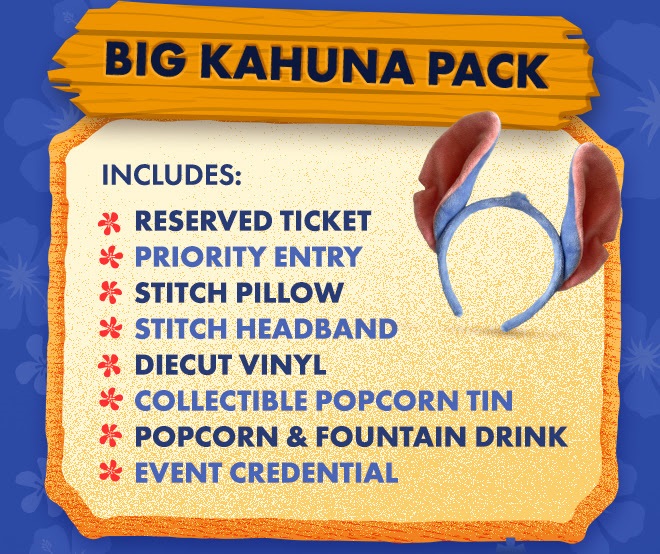 - Big Kahuna Pack ( $128.00 per ticket): Includes Reserved Seat, Priority Entry, Stitch Pillow, Stitch Headband, Diecut Vinyl, Collectible Popcorn Tin with popcorn, Fountain Drink, and Credential