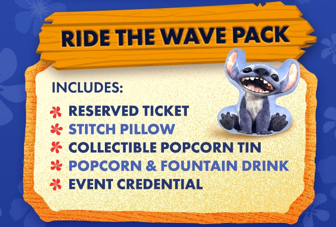 - Ride the Wave Pack ($78.00 per ticket): Includes Reserved Seat, Stitch Pillow, Collectible Popcorn Tin with Popcorn Fountain Drink, and Credential