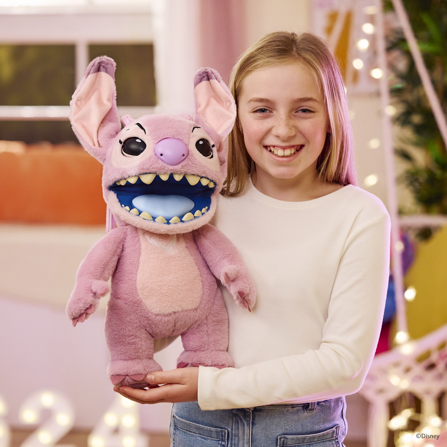 - Just like Stitch, Angel has a variety of distinct features that bring her to life, including a repertoire of language, realistic movements and touch sensors that have been designed to elicit fun and endearing reactions.