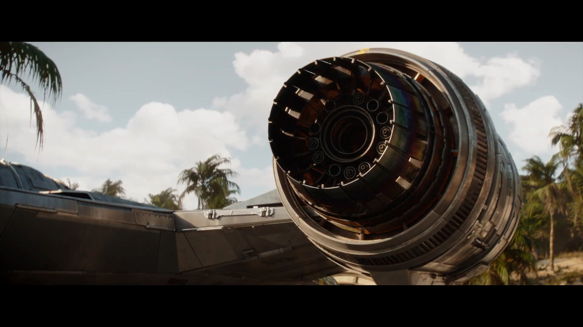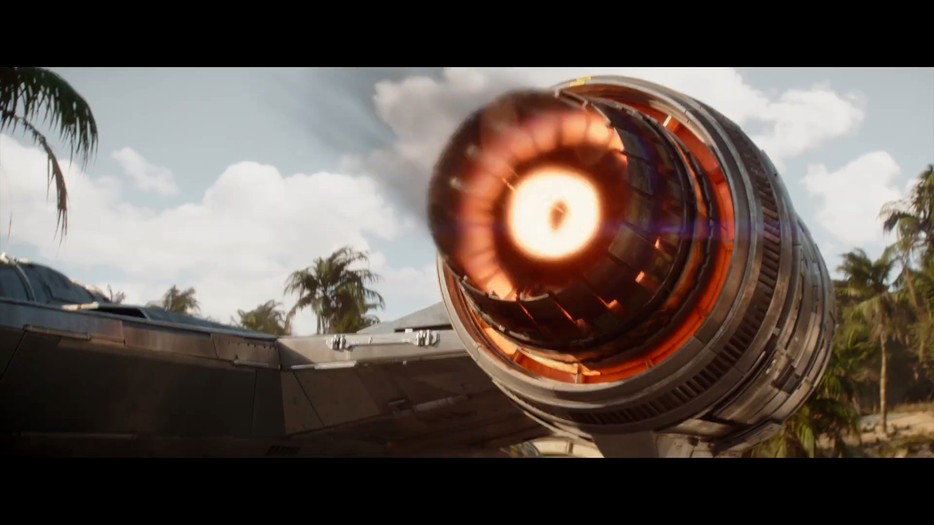 - Shot #6 - Against the palm trees of Adelphi Base in the background, we see one of the Razor Crest's engines fire up and then burn out. I should note that while Din Djarin's first Razor Crest ship was destroyed by the Imperial remnant in season 2 of The Mandalorian, it seems as though he has acquired a new ship of the same model. In-between, as established in The Book of Boba Fett, he and Grogu were using a souped-up Naboo N-1 starfighter, but it would be difficult to fit bounties inside of that ship.