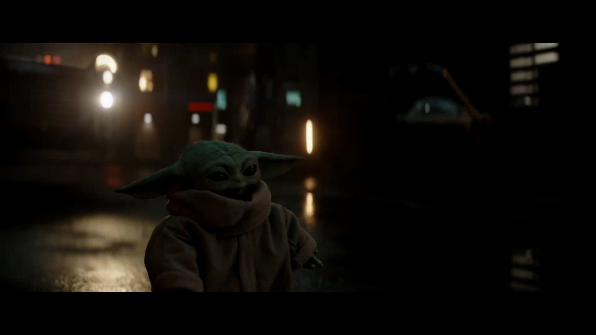 - Shot #14 - A cityscape at night. This could be on the planet Coruscant or a number of other locations in the Star Wars underworld such as Nal Hutta or Nar Shadda. A ship zooms into frame and under a bridge, but it doesn't look like the Razor Crest to me.