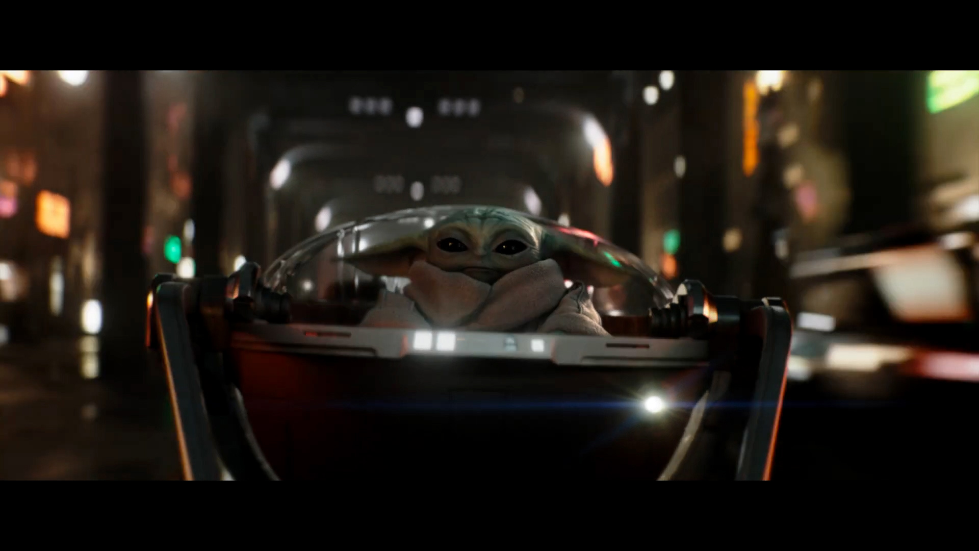 - Shot #80 - Medium shot attached to the front of Grogu's new hover-pram, watching him as he zooms down the alleyway.