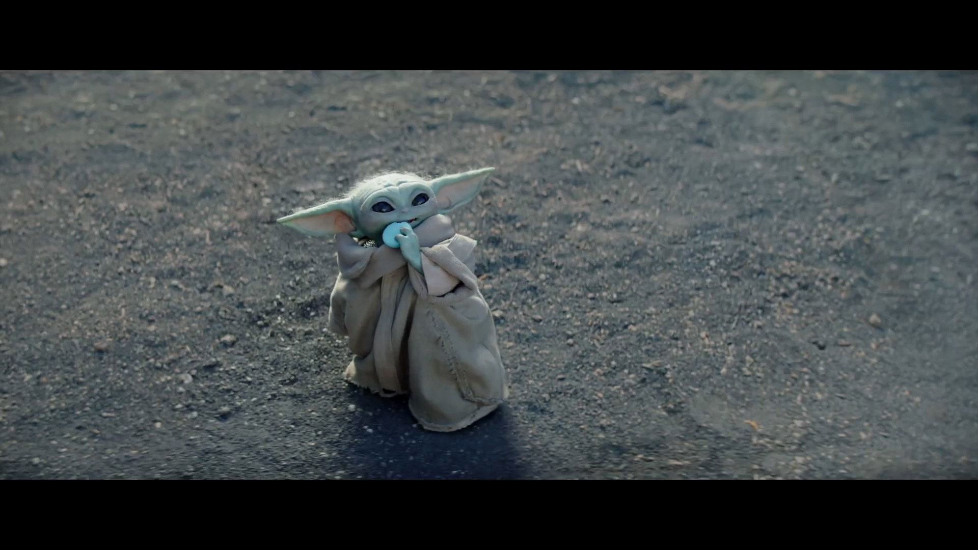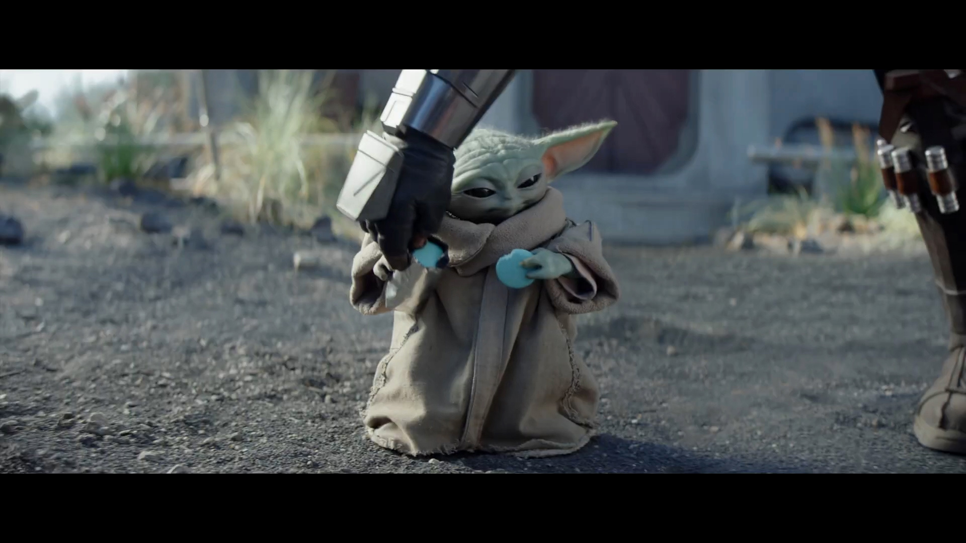 - Shot #86 - We're on the rocky/grassy planet from the stormtrooper chase scene above. My guess is this is either at Adelphi Base or on Nevarro, where Din Djarin and Grogu have made their homestead. Mando's hand reaches in and grabs a pack of blue cookies from Grogu.
