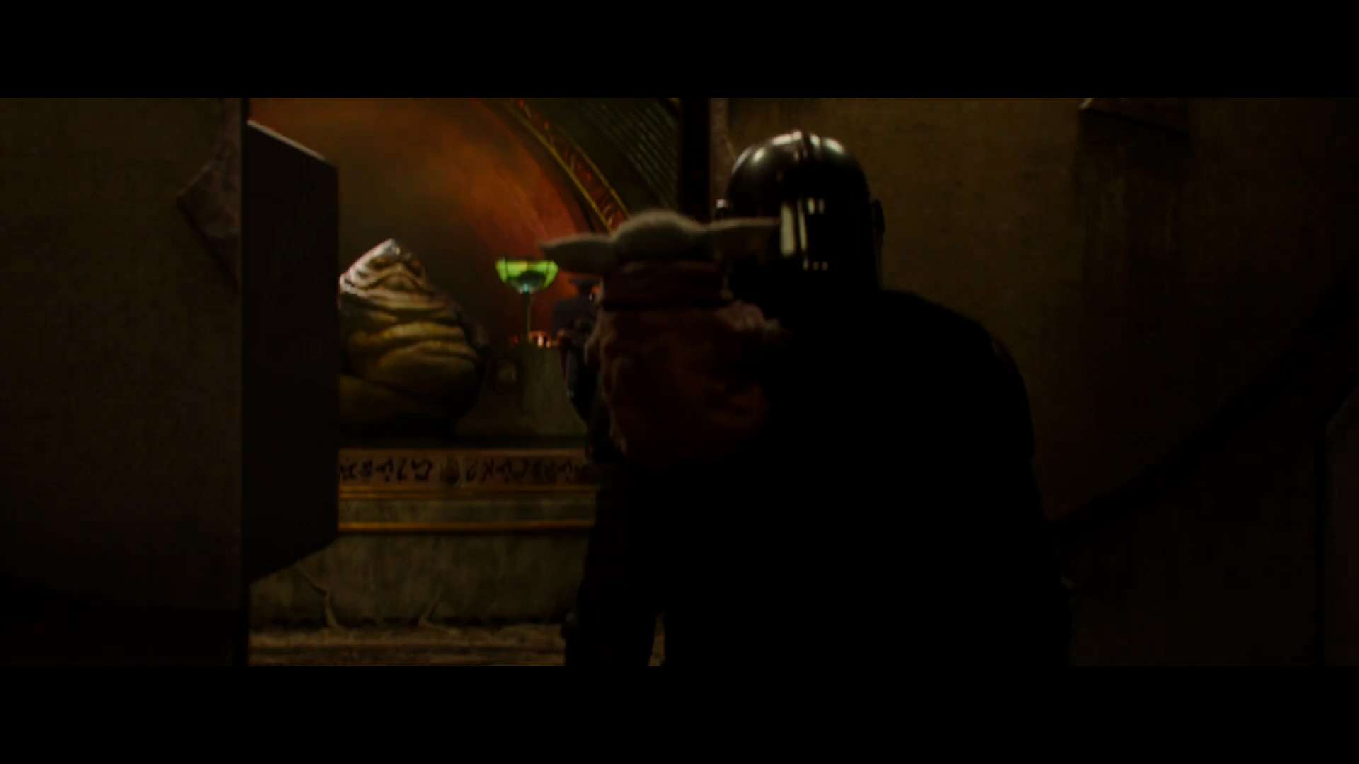 - Shot #21 - From behind Mando (with Grogu perched on his shoulder), the doors open to reveal the Hutt Twins from The Book of Boba Fett on their dais. We don't know these characters' names just yet, but hopefully they will be revealed in the film.